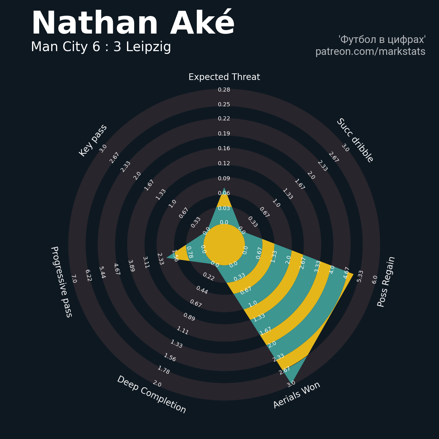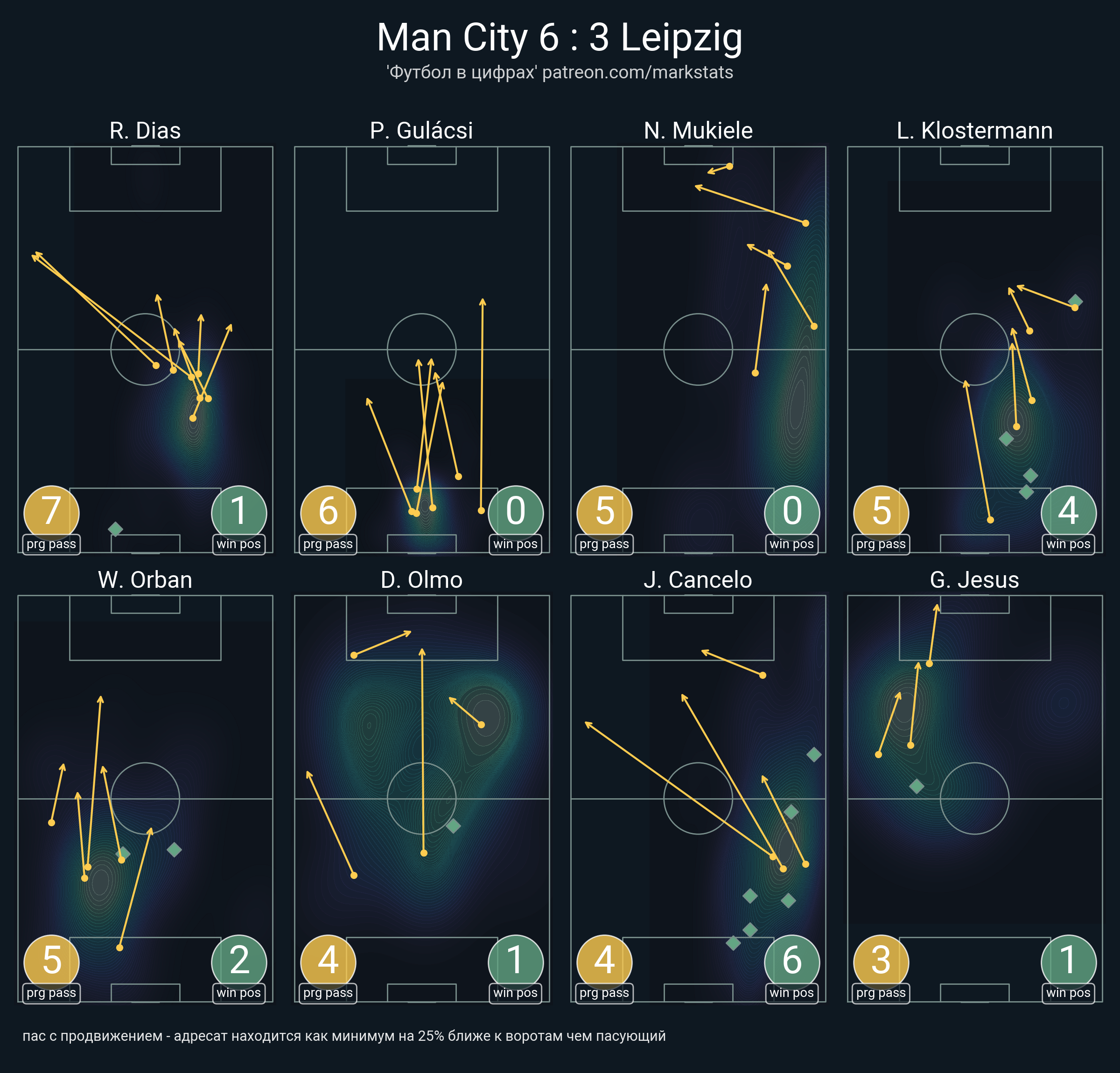 ▪ 16 успешных передач из 20 попыток (1 ассист, 1 под удар, 4 с продвижением, 6 на трети соперника)