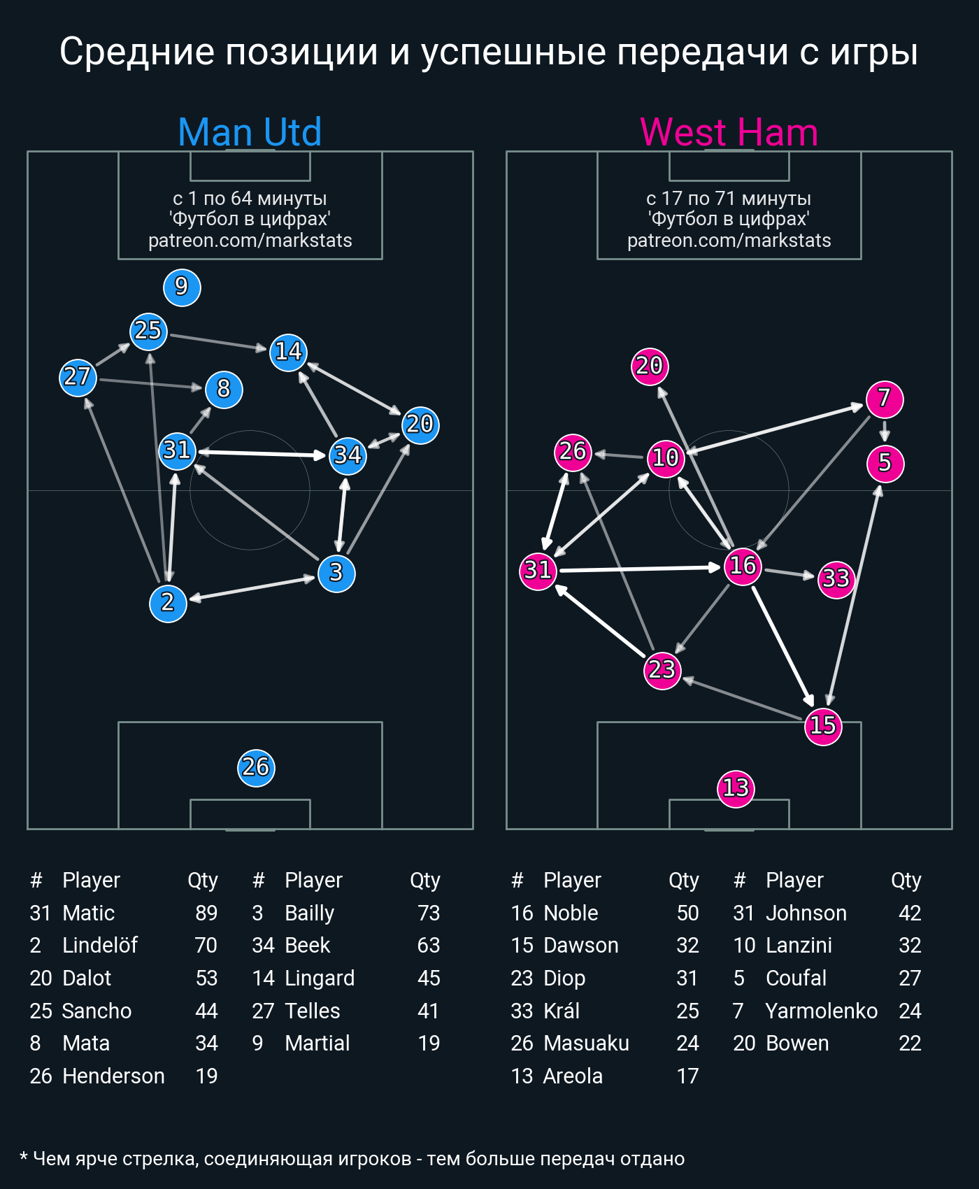 ▪ 54 успешных передач из 64 попыток (2 под удар, 5 с продвижением, 8 на трети соперника)
