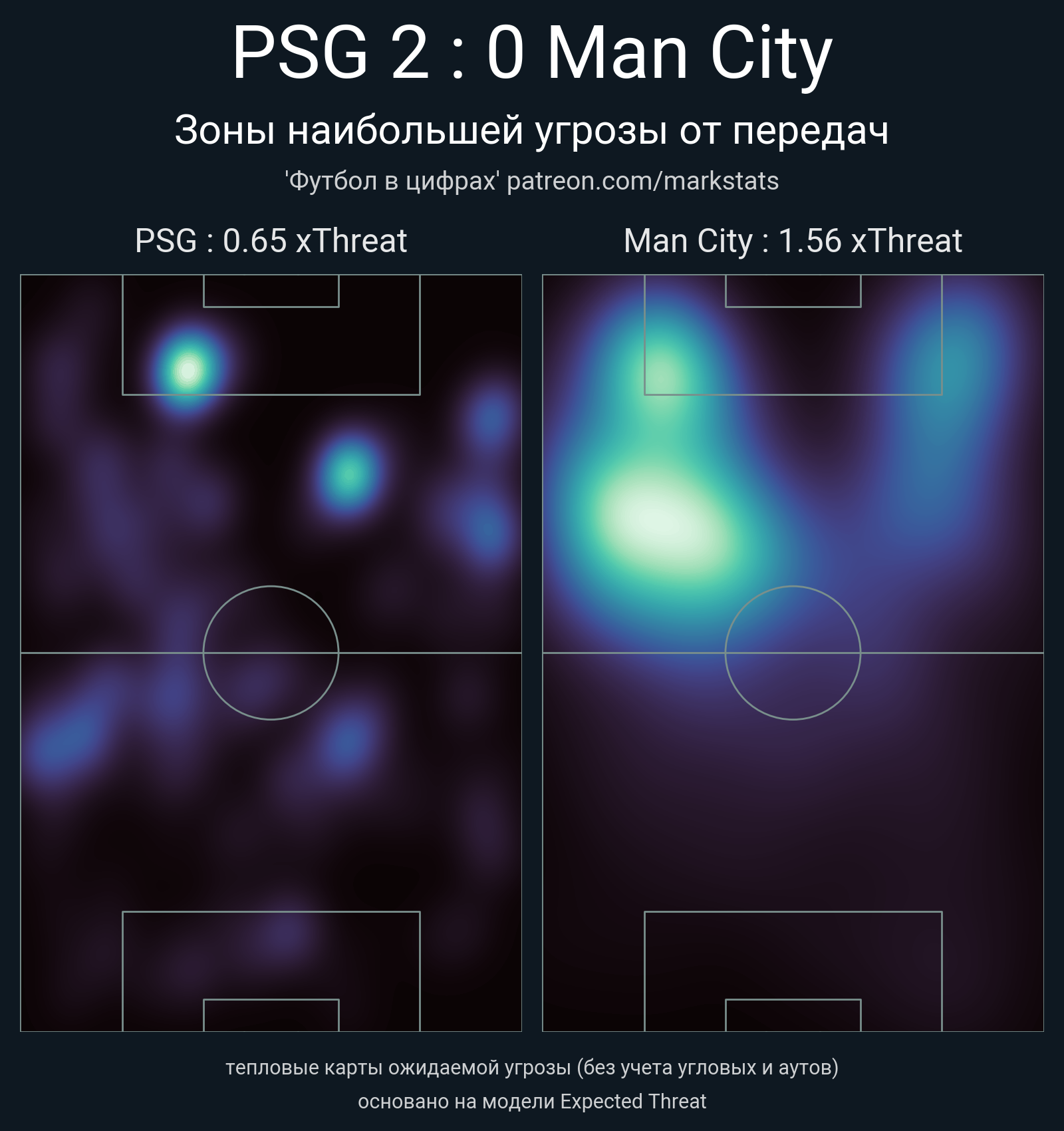 ▪ xThreat без учета угловых: 0.65 - 1.56