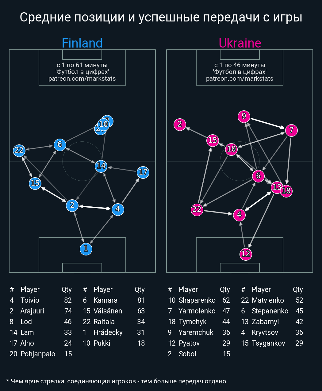 ▪ 43 успешных передач из 54 попыток (2 под удар, 6 с продвижением, 18 на трети соперника)
