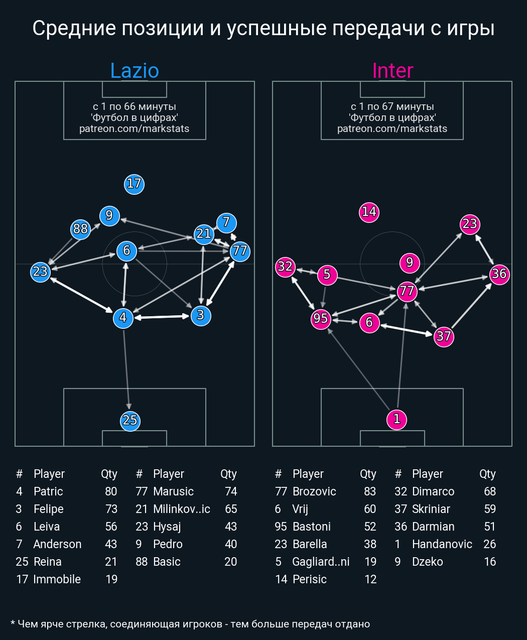 ▪ 53 успешных передач из 65 попыток (3 под удар, 5 с продвижением, 12 на трети соперника)