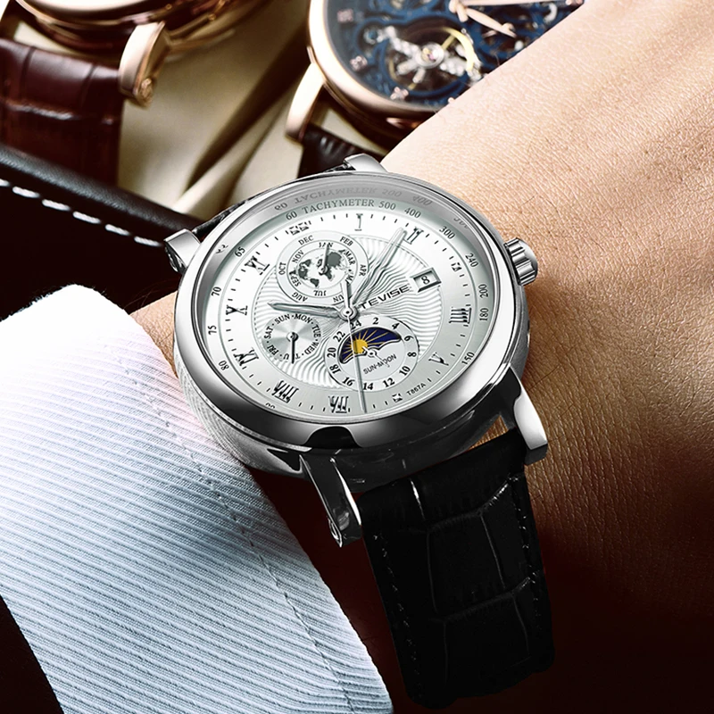"2021 New TEVISE Mens Watches Moon Phase 50M Waterproof Watch Multifunctional Automatic Mechanical Watch Leather Bracelet Watch" * Buy Now Just For 50$