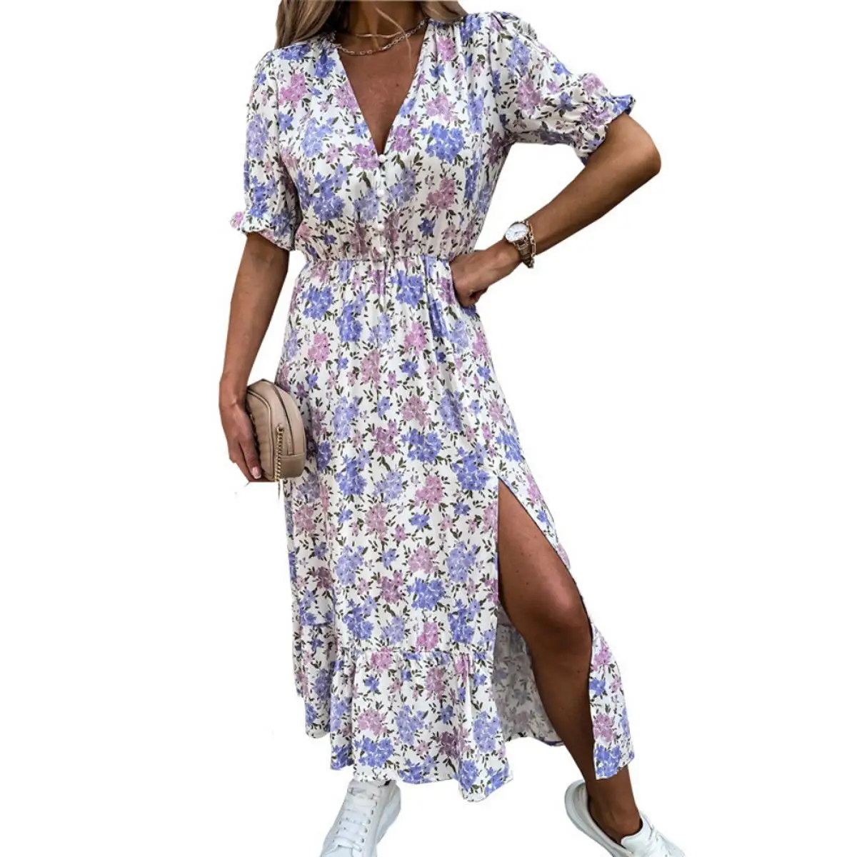 «2021 Spring and Summer Dress Women's Hot Sale Printed Short-Sleeved V-Neck Slit Waist Mid-Length Dress» по лучшей цене на рынке! Всего за 15$ (1425рублей)