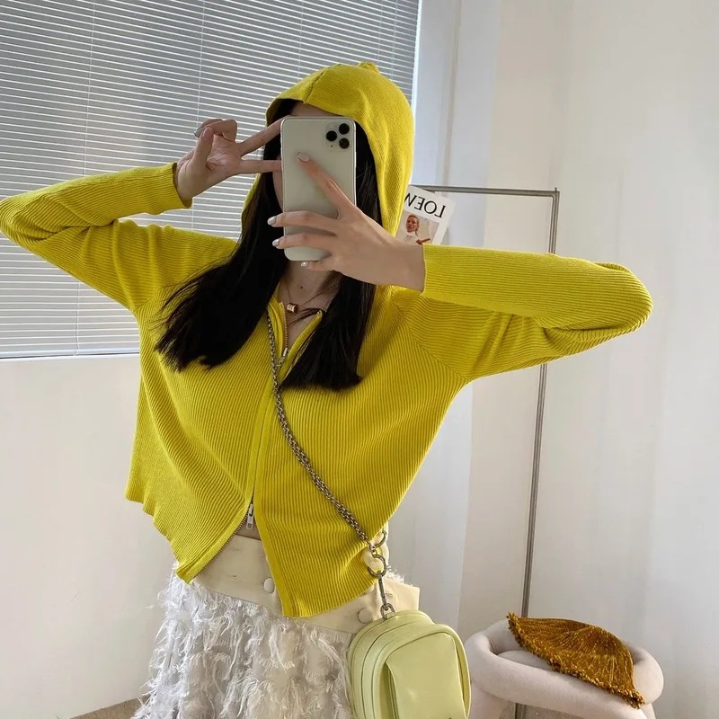 «2021 Women Spring Tight-fitting Short Zipper Knitted Cardigan Black Yellow Temperament Fashion Long-sleeved Hooded Small Jacket» по лучшей цене на рынке! Всего за 17$ (1615рублей)