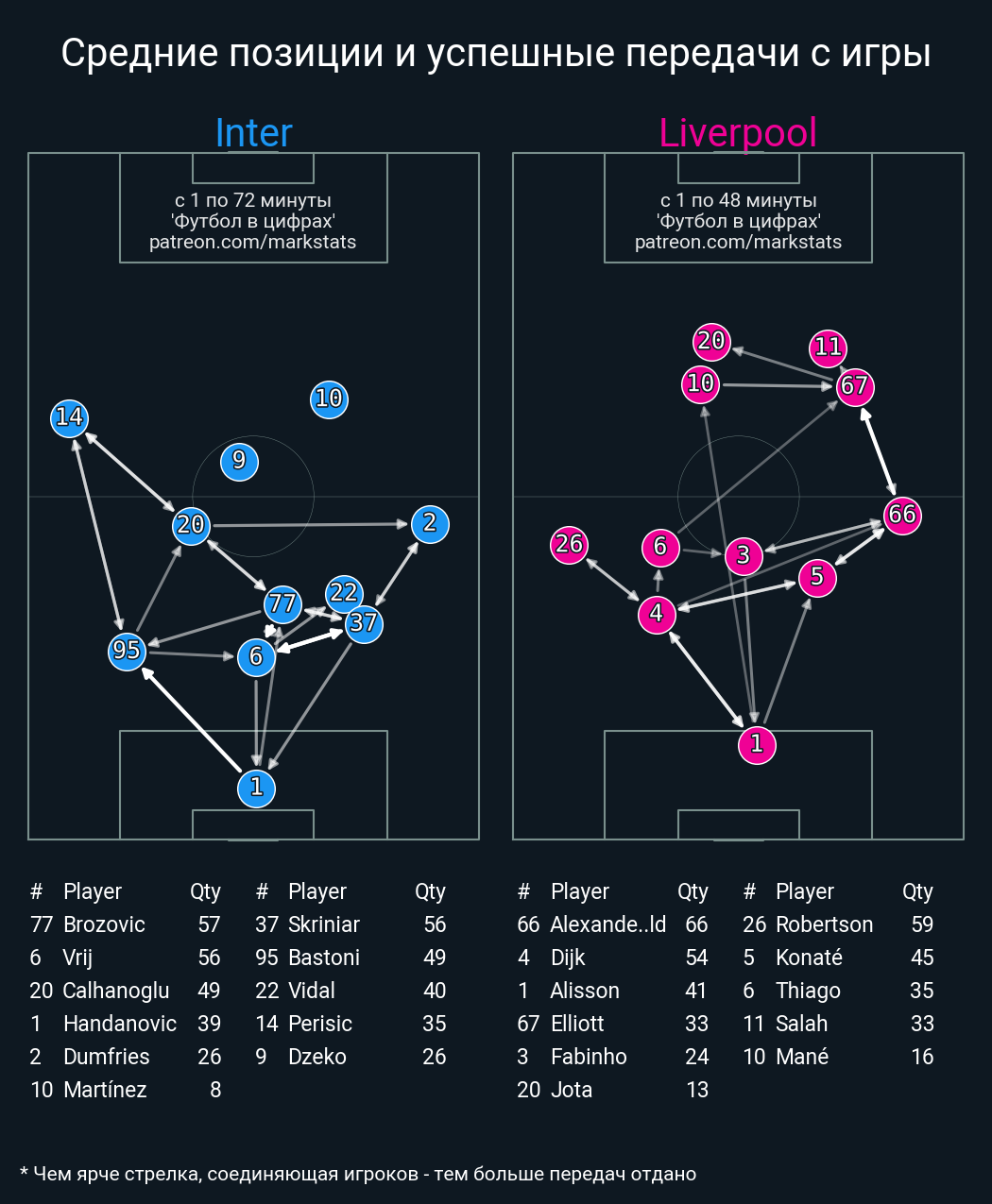 ▪ 46 успешных передач из 54 попыток (4 с продвижением, 3 на трети соперника)