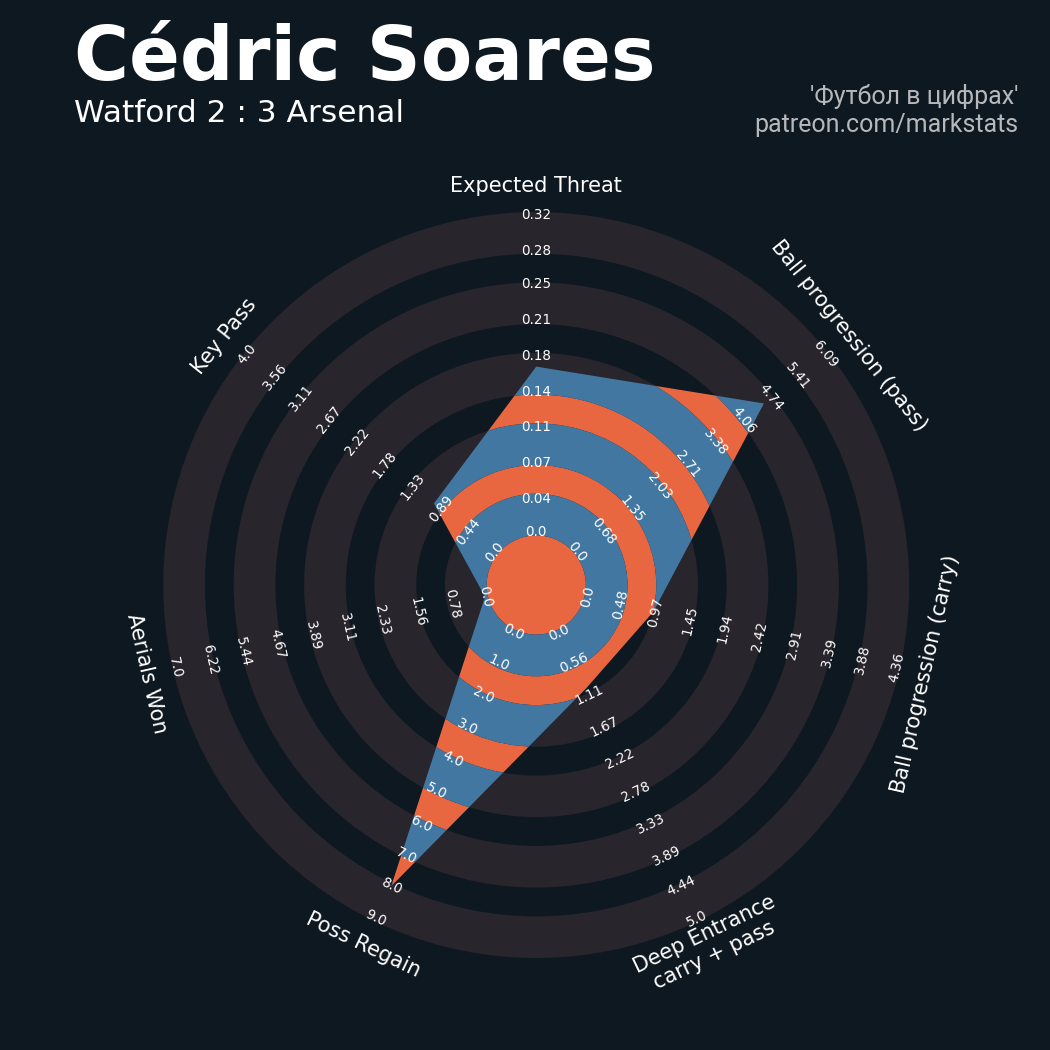 ▪ 69 успешных передач из 80 попыток (1 под удар, 3 с продвижением, 7 на трети соперника)