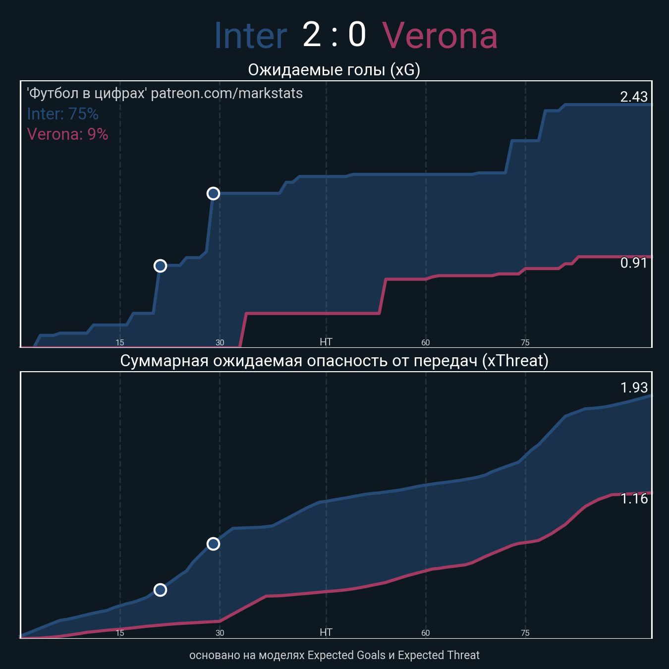 ▪ xThreat без учета угловых: 1.72 - 1.03