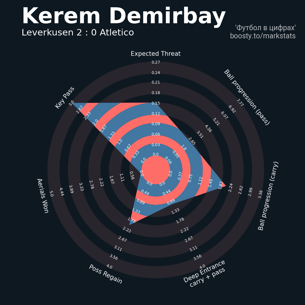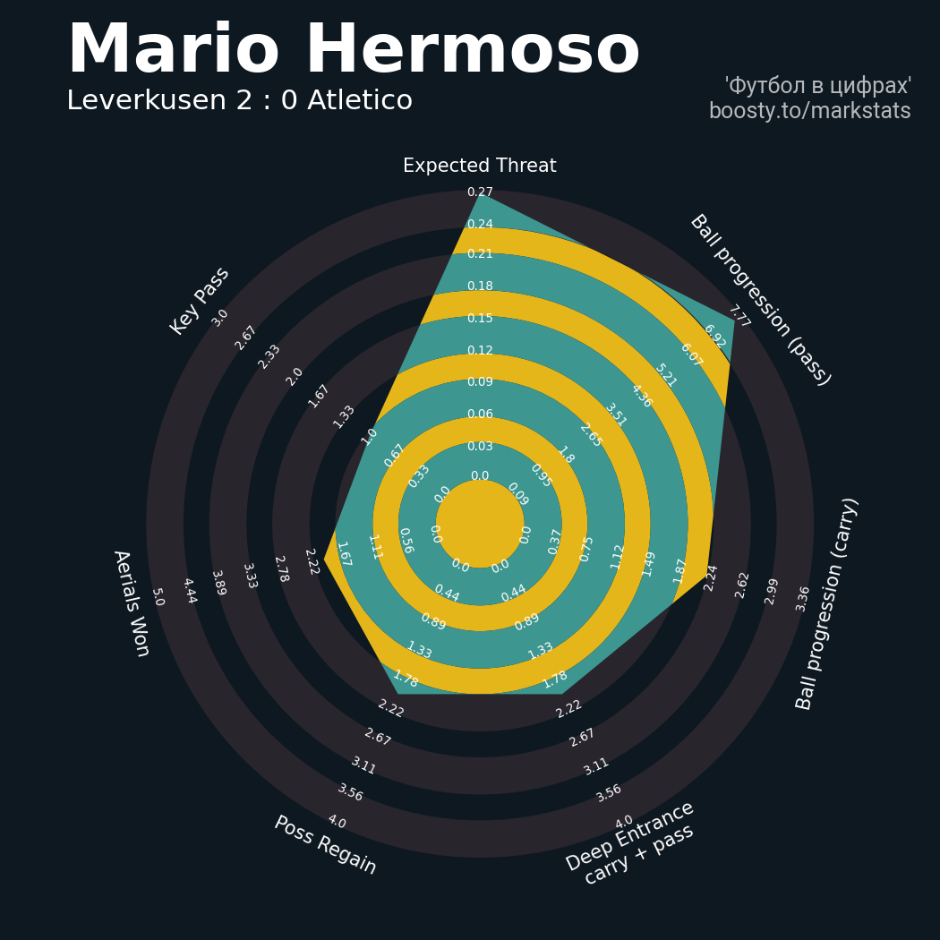 ▪ 7 успешных передач из 9 попыток (2 ассист, 2 под удар, 1 с продвижением, 4 на трети соперника)