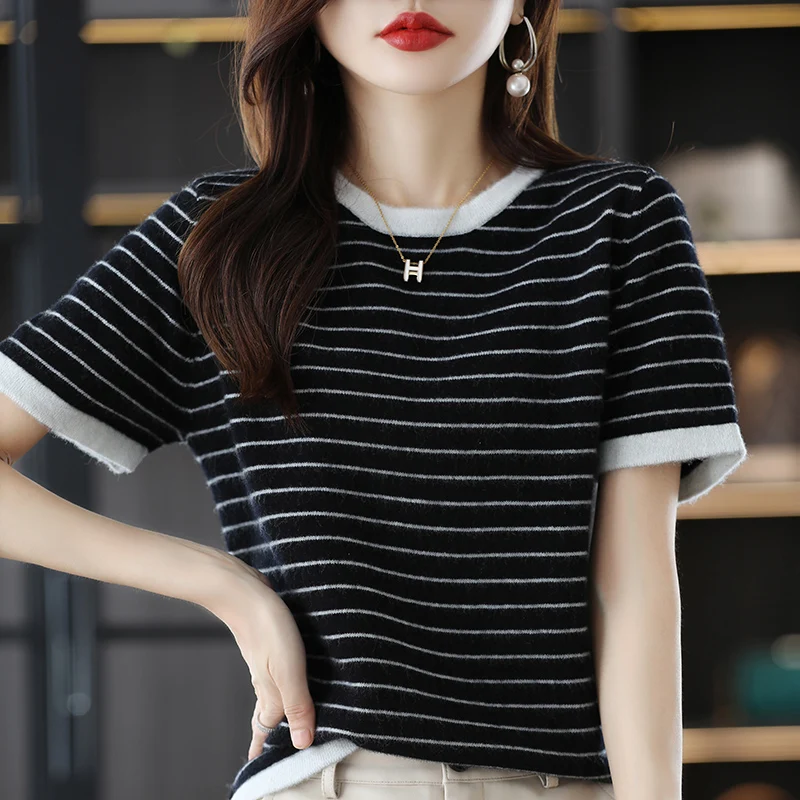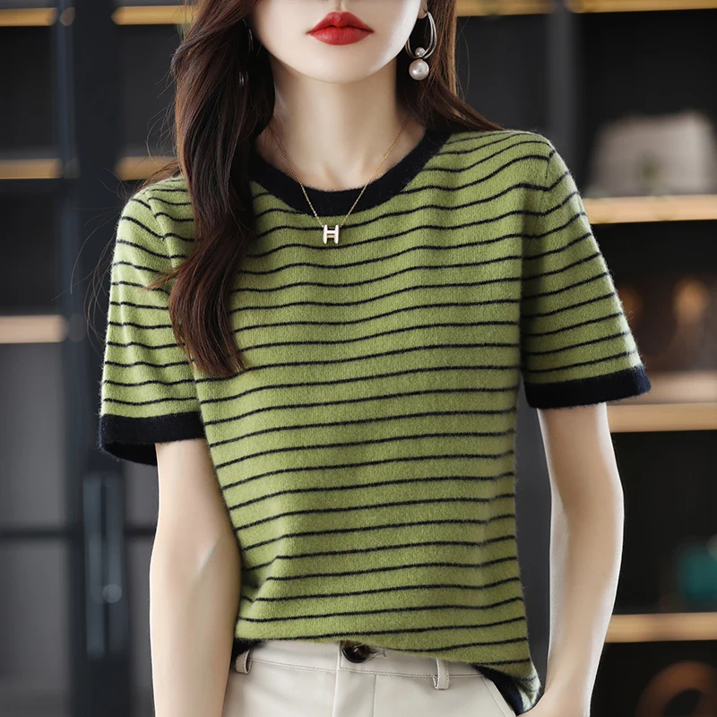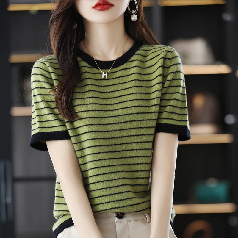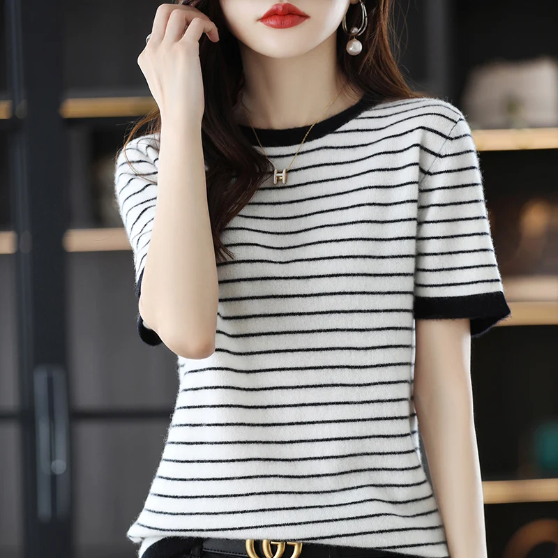 «2022 New 100% Pure Wool Short Sleeve T-Shirt Women's Loose Stripe Color Matching Sweater Joker Half Sleeve Short Jacket» по лучшей цене на рынке! Всего за 30$ (2850рублей)
