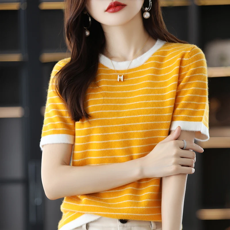 jHjhUawqafДолго искали 2022 New 100% Pure Wool Short Sleeve T-Shirt Women's Loose Stripe Color Matching Sweater Joker Half Sleeve Short Jacket, но не могли найти? Предоставляем вашему вниманию 2022 New 100% Pure Wool Short Sleeve T-Shirt Women's Loose Stripe Color Matching Sweater Joker Half Sleeve Short Jacket по лучшей цене на рынке!