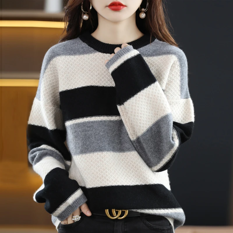 «2022 New Warm Round Neck Cashmere Sweater Women Stripe Stitching Pullovers Loose Long Sleeved knittingTops in Autumn Winter» по лучшей цене на рынке! Всего за 119$ (11305рублей)