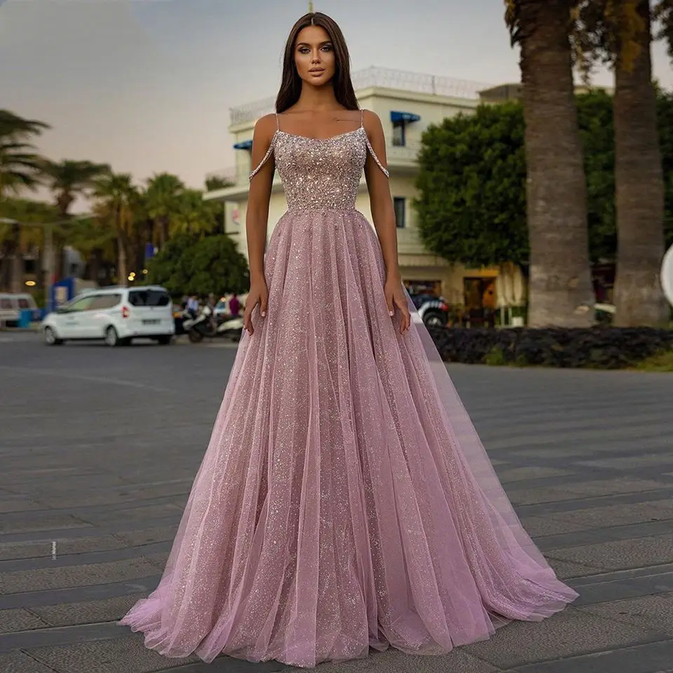 "2022 Pink Glitter Prom Dress Sparkly Tulle Evening Dress Spaghetti Straps A-Line Formal Prom Gown For Women Party Robes De Bal" * Buy Now Just For 119$