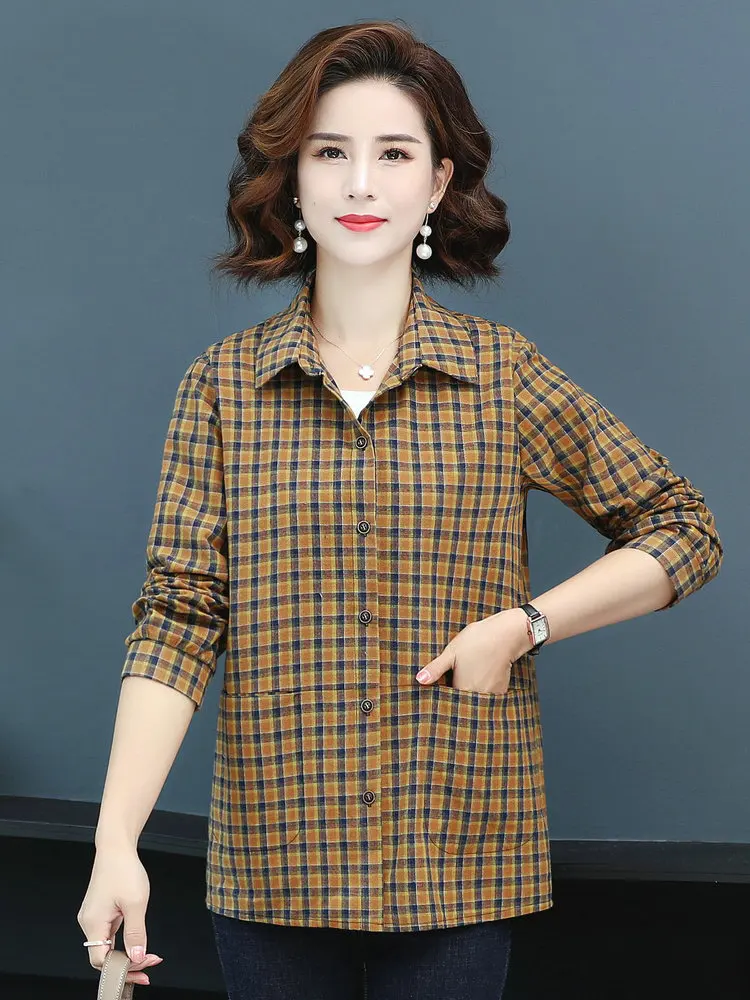 "2022 Spring Women Plaid Cotton Shirts With Side Pockets Design Red Yellow Checked Pattern Turn Down Collar Long Sleeve Cozy Tops" * Buy Now Just For 26$