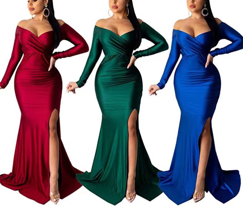 2022 Spring and Summer New Women's Fashion Off Shoulder Solid Color Hip Wrap Dress