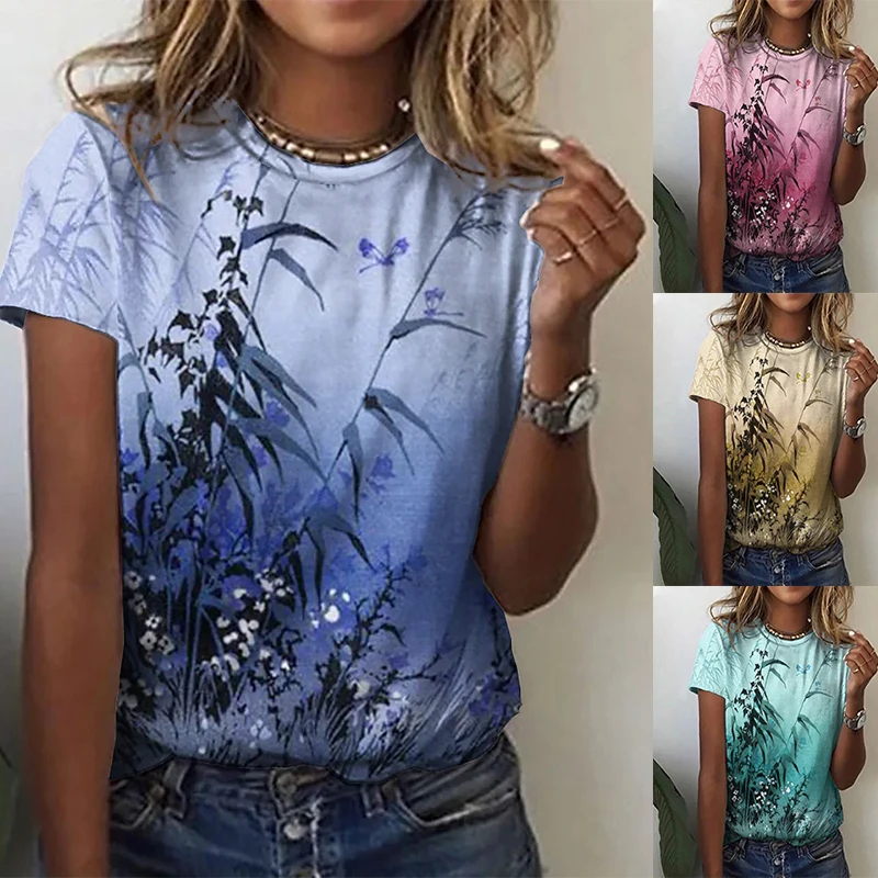 "2022 Summer Women's Flower Theme Painting Fashion Loose Version Round Neck Abstract 3D Printed Loose Casual Top Fational Pullove" * Buy Now Just For 3$