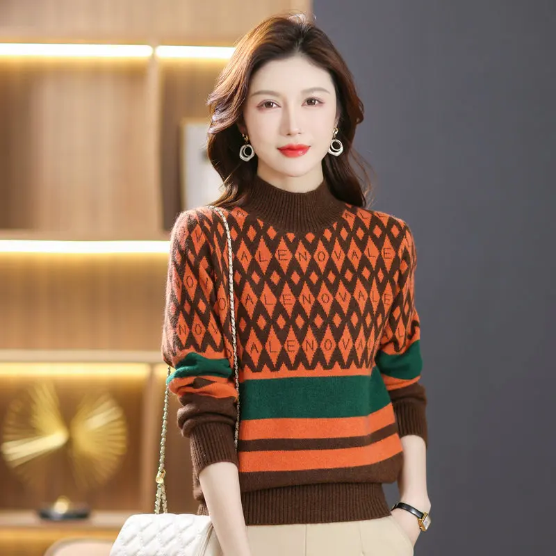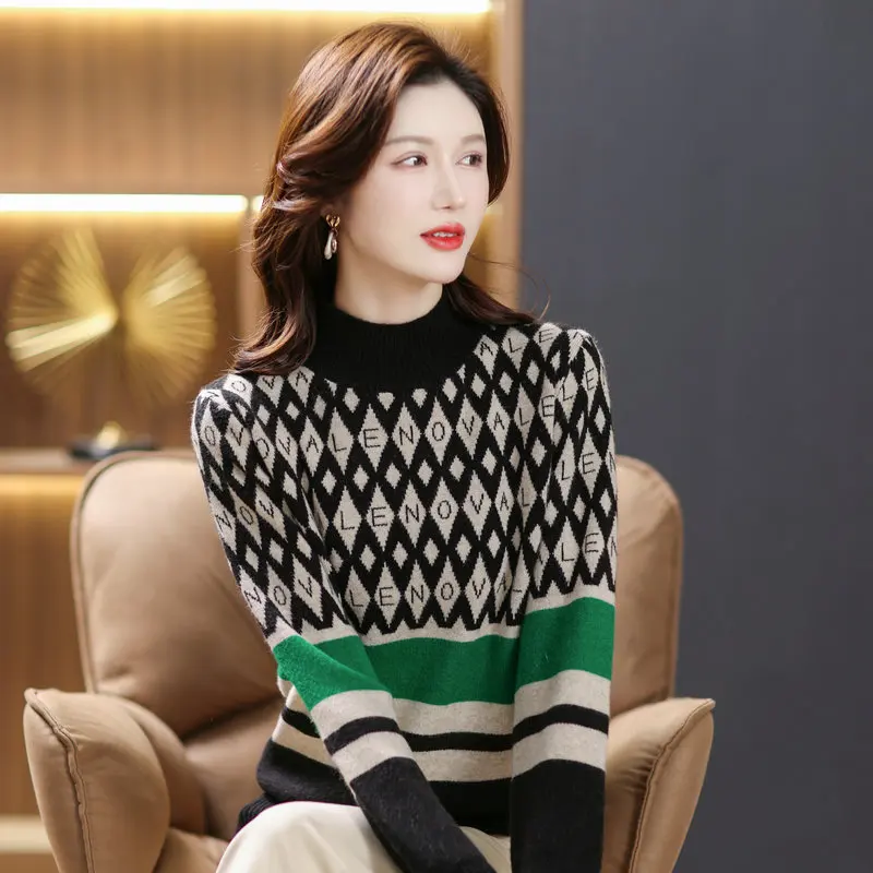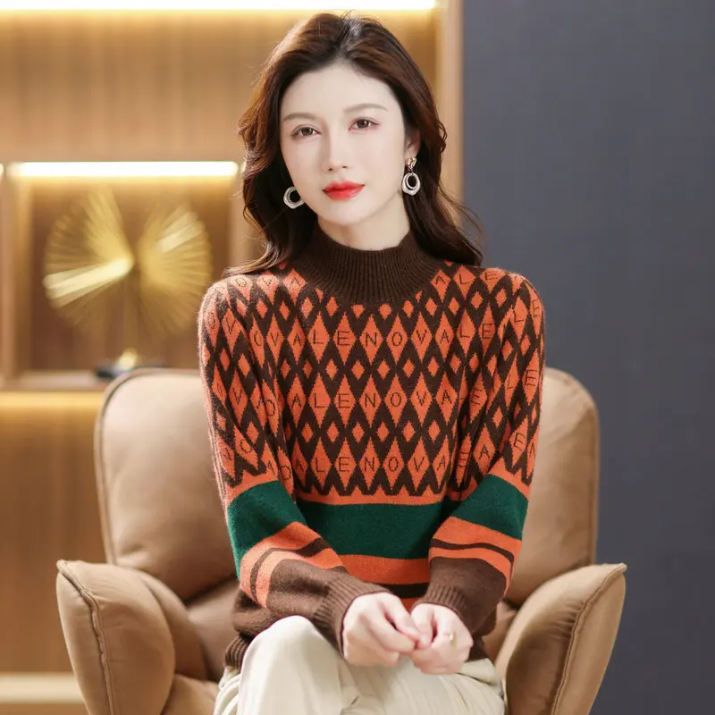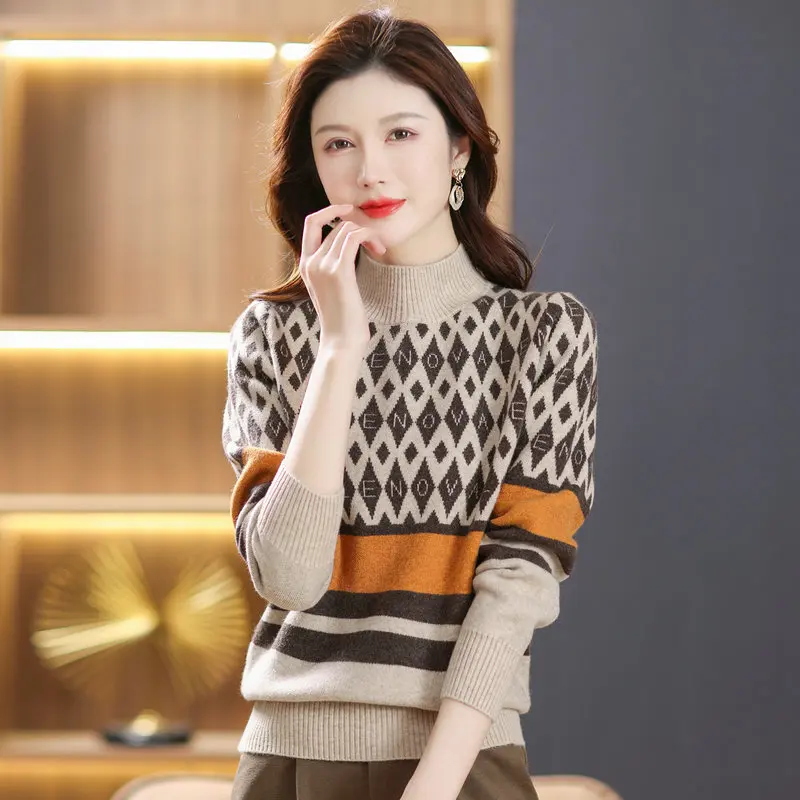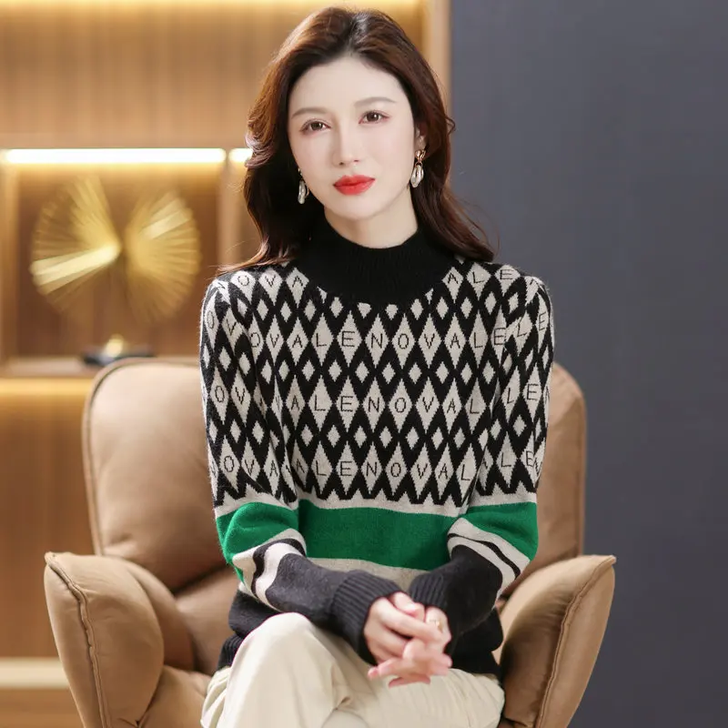 «2022 Winter Women Camel Green Brown Argyle Pattern Pullover Sweaters Mock Neck Soft Warm Jersey Striped Thermal Knitwear» по лучшей цене на рынке! Всего за 37$ (3515рублей)