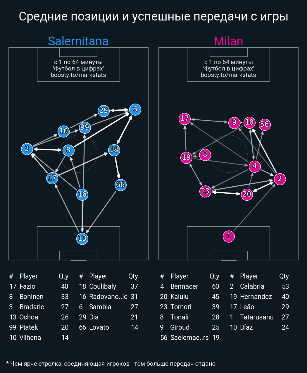 ▪ 50 успешных передач из 61 попыток (1 под удар, 3 с продвижением, 6 на трети соперника)