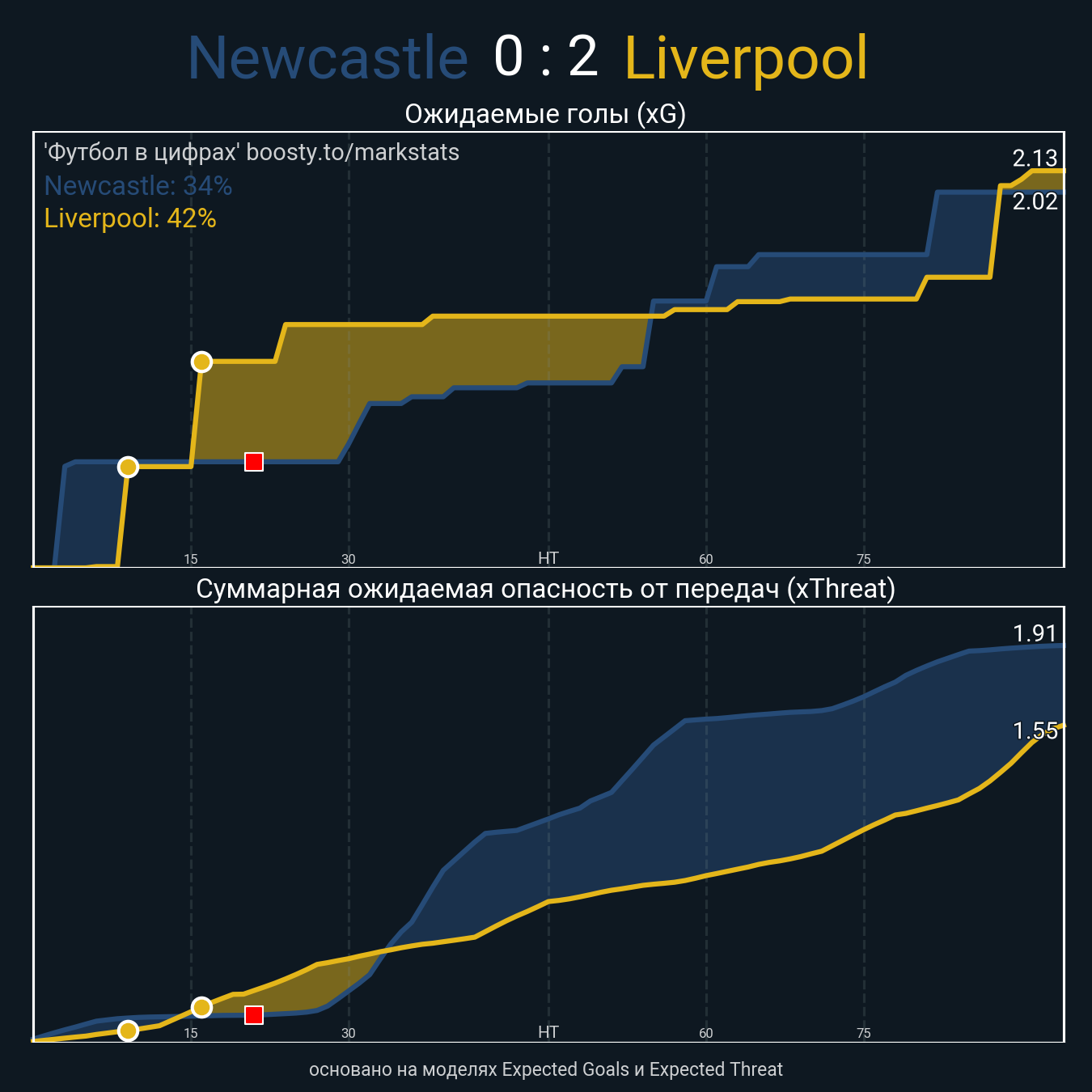 ▪ Ожидаемые голы (NPxG): 2.02 - 2.13