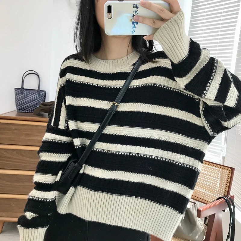 «2023 Autumn Winter New Color Stripe Long Sleeve Pullover Sweater Women's Loose Korean Style Lazy Style O-Neck Sweater Female» по лучшей цене на рынке! Всего за 24$ (2280рублей)