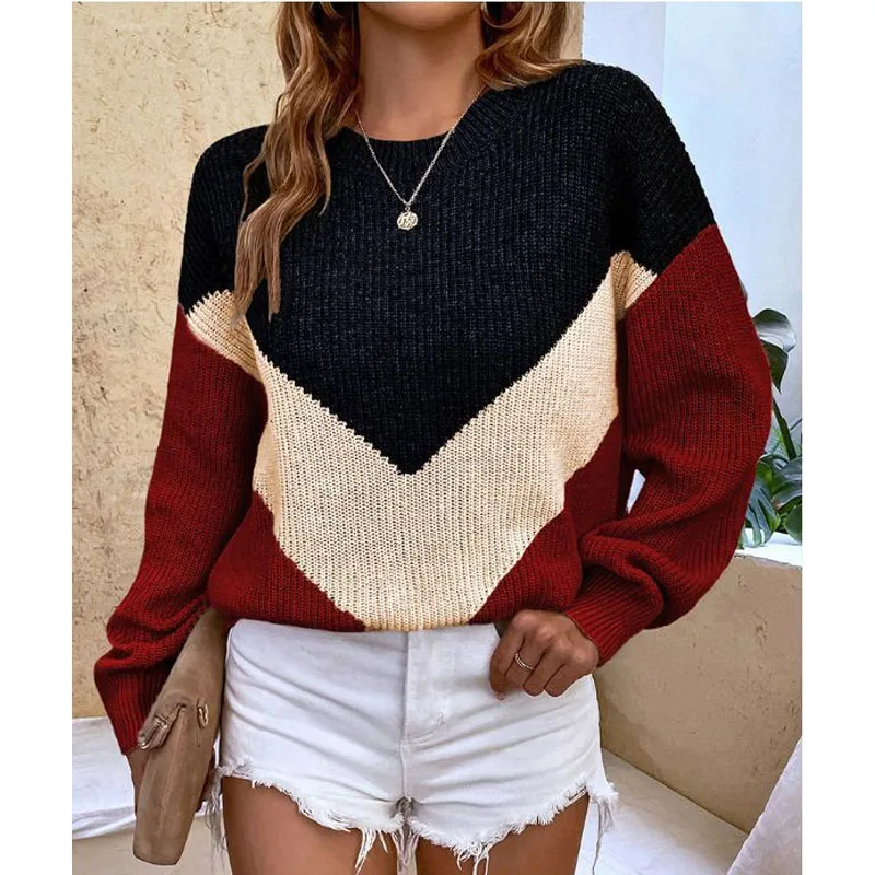 2023 Autumn and Winter Fashion Color Matching Geometric Inverted Triangle Casual Simple Pullover Lantern Sleeve Knitted Sweater - Купить с бесплатной доставкой