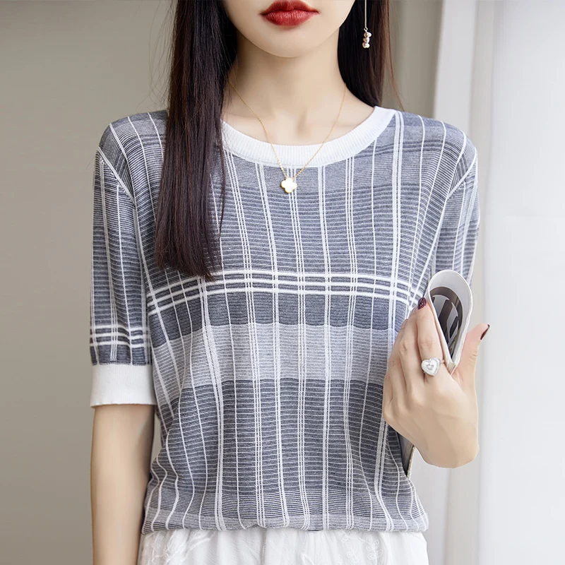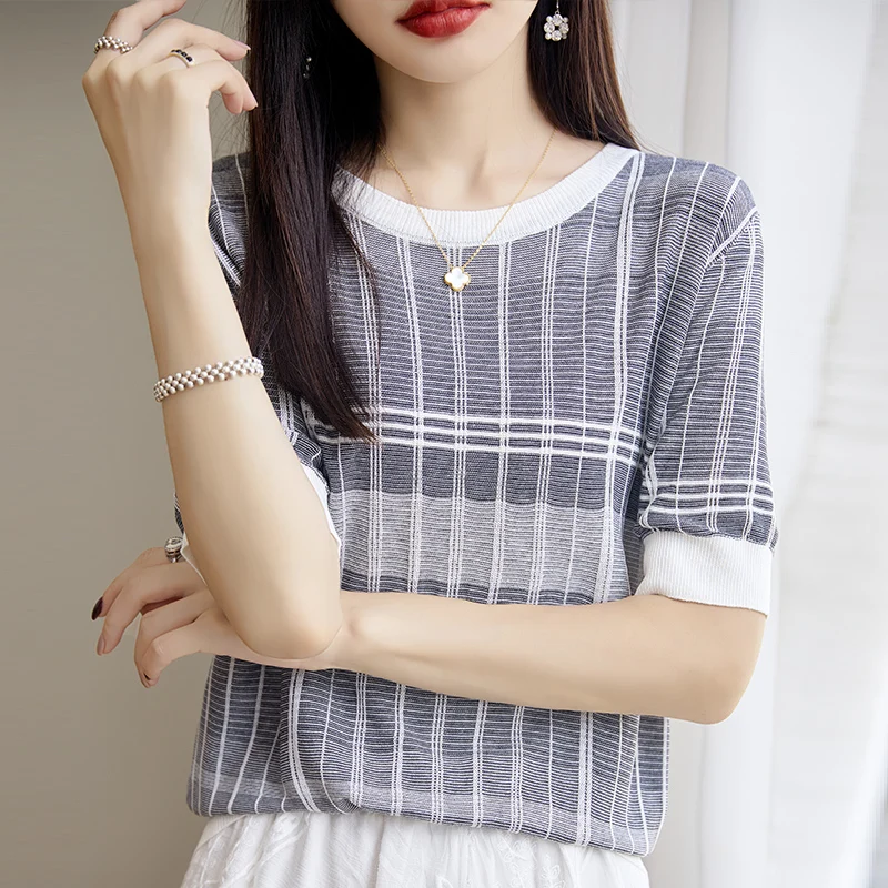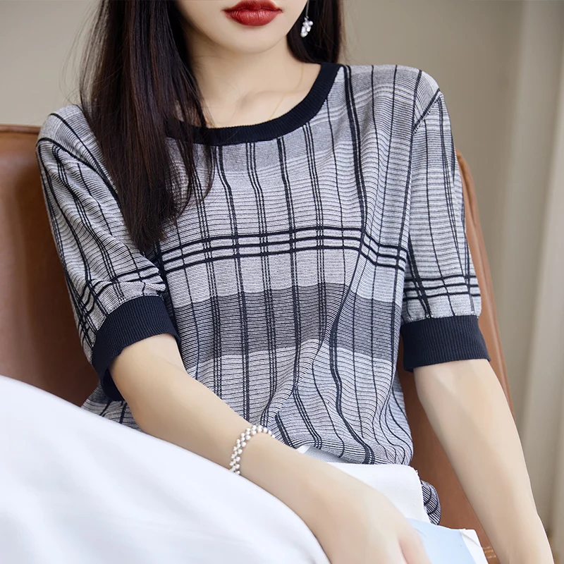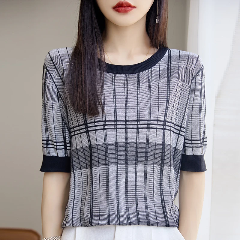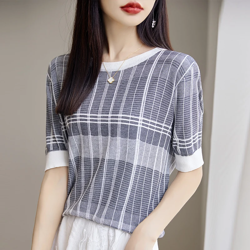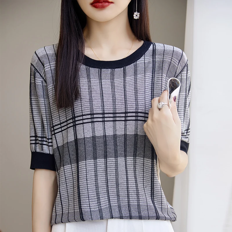 SjEhvcfVOЗдесь вы сможете купить 2023 Summer New Tiansi Linen Short Sleeve Women's Versatile Grid Pattern Thin Design Sense Small Size Loose Knitted Shirt Top с бесплатной доставкой до вашего почтового отделения.
