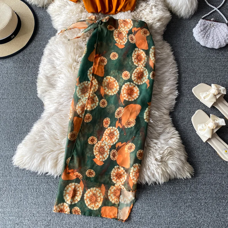 "2023 Summer Women's Two Piece Set High Waist Split Printed Beach Skirt and Short Sleeve Round Neck Orange T-Shirt Female Suits" * Buy Now Just For 22$