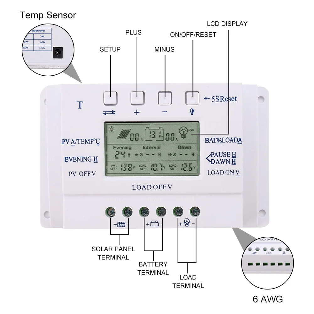 20A 12V/24V Auto MPPT LCD Display Solar Charger Controller for Lighting System Solar Panel Battery Regulator T20 Intelligent Mic - Купить с бесплатной доставкой