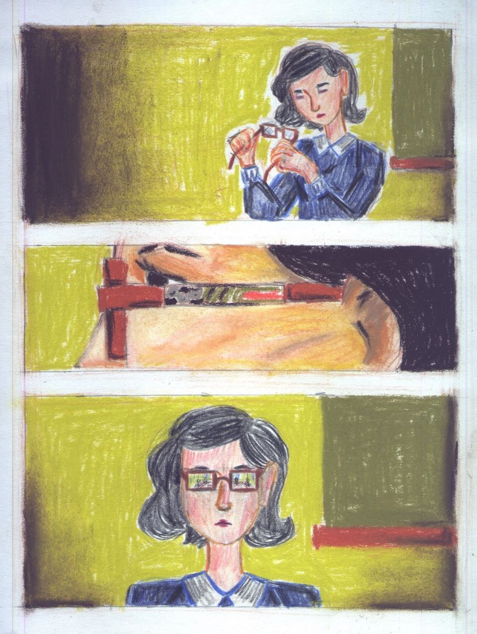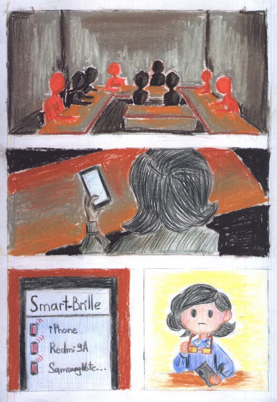Die Brille hat ein eingebaute Microcomputer, mit dessen Hilfe der Lehrer verdichtige Schüler sieht. Diese Verbrechern werden automatisch mit Rot markiert.