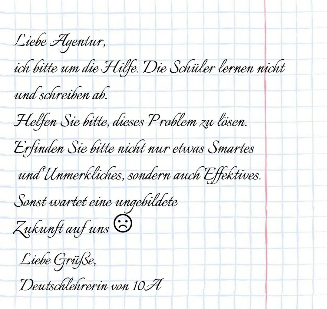 Es gibt immer mehr Beschwerden von Lehrern bei unserer Agentur, dass Kinder deren den Bildungsprozess gleich gültig ist und sie Kontrollarbeiten einfach abschreiben.