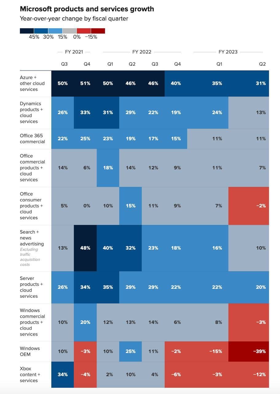 Драйвером роста в сложившейся ситуации выступает облачный сегмент бизнеса — точно так же, как и в случае Амазона и AWS. За квартал облачка подросли на +18%, при этом великий и могучий Azure с сателлитами вырос аж на 31%. Однако и над ними сгущаются кризисные тучки, вызванные увольнениями: сами Майки предупреждают, что на их фоне рост сегмента скорее всего замедлится, чуда не произойдет. Зато можно ждать инноваций: пока что именно Azure называют основным партнером OpenAI от Майкрософта, именно он будет первым тестировать и интегрировать новые фичи (например, ChatGPT), после чего они будут расползаться по другим продуктам — Bing, Microsoft 365 и прочая, про это читайте подробнее в нашем недавнем посте.
