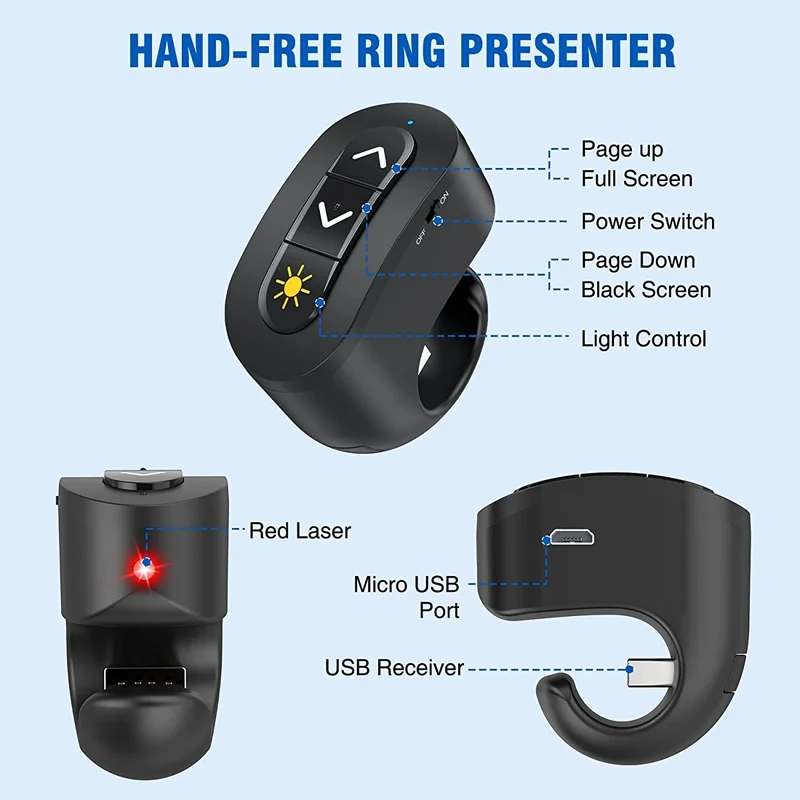 FtclxmuhcwHere you can buy 2.4GHz Rechargeable Wireless Presenter Finger Ring with Red Light USB Presentation Remote for Win 10 8 7 XP Power Point with free delivery to your post office.
