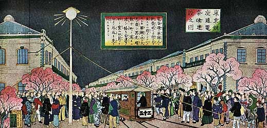 По случаю празднования открытия японского центрального телеграфа в большом зале токийского Императорского инженерного училища 工部大学校 (яп. кобу дайгакко) загорелась первая угольная дуговая лампа в Японии. Это событие стало первым зафиксированным случаем использования электричества в истории страны, в честь чего за 25 марта закрепилось поименование «день электричества» 電気記念日 (яп. дэнки кинэнби). О полноценной эликтрификации страны в конце 70-х годов XIX века говорить, разумеется, ещё не приходится – даже в технологически более развитых западных державах до этого ещё было далеко – однако в данном случае показательно использование электричества с целью освещения пространства. Именно в этом направлении будет развиваться область применения электричества в первые годы его внедрения в Японии. Дуговая лапа, с которой всё началось, была представлена публике приглашенным профессором инженерного училища, заведующим направлением естественной философии и телеграфии Уильямом Эдвардом Айртоном (William Edward Ayrton). Он прибыл в Японию в 1873 году для обучения студентов основам физики и электроинженерии, и помимо лекций, проводил многочисленные эксперименты в созданной и при училище лаборатории, устройству которой удивлялись даже приезжавшие в Токио с визитом британские инженеры. Вместе со студентами Айртон установил дуговую лампу и запитал её от 50 гальванических элементов Грове. Вероятно, сейчас её свет показался бы тусклым, но тогда, судя по той степени значимости, которая придаётся событию, электрическое освещение произвело сильное впечатление на очевидцев и значительно превосходило по яркости и интенсивности газовые осветительные приборы, которые уже нашли своё применение в стране к этому времени.