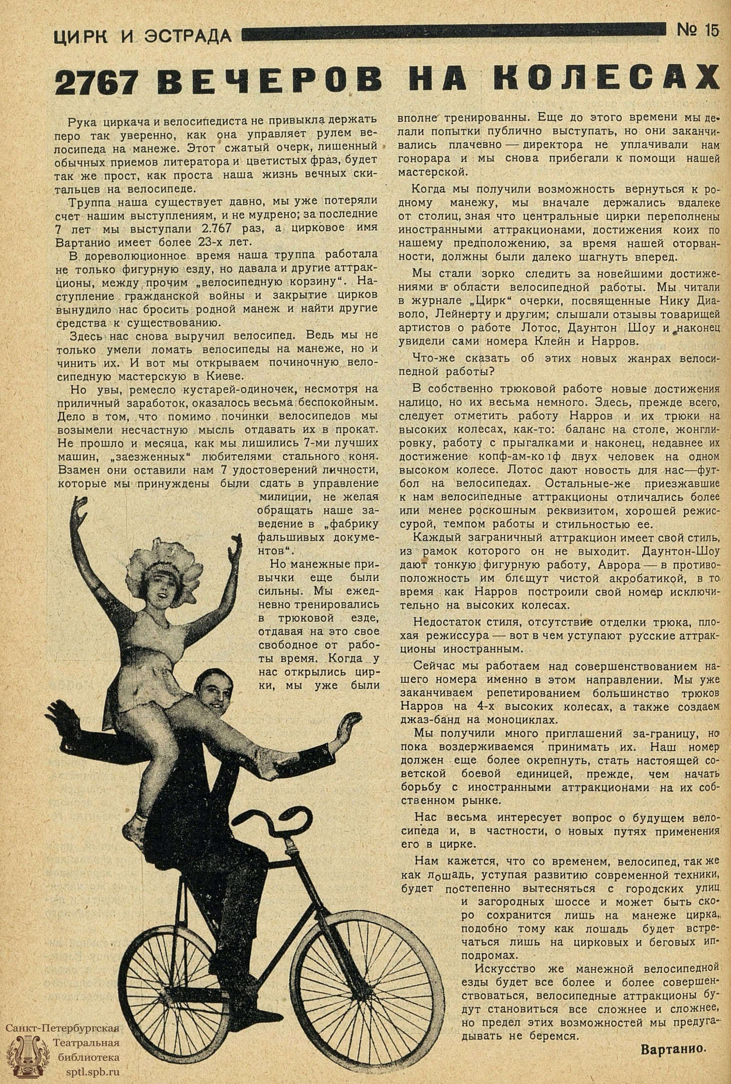 Труппа наша существует давно, мы уже потеряли счет нашим выступлениям, и не мудрено; за последние 7 лет мы выступали 2.767 раз, а цирковое имя Вартанио имеет более 23-х лет.