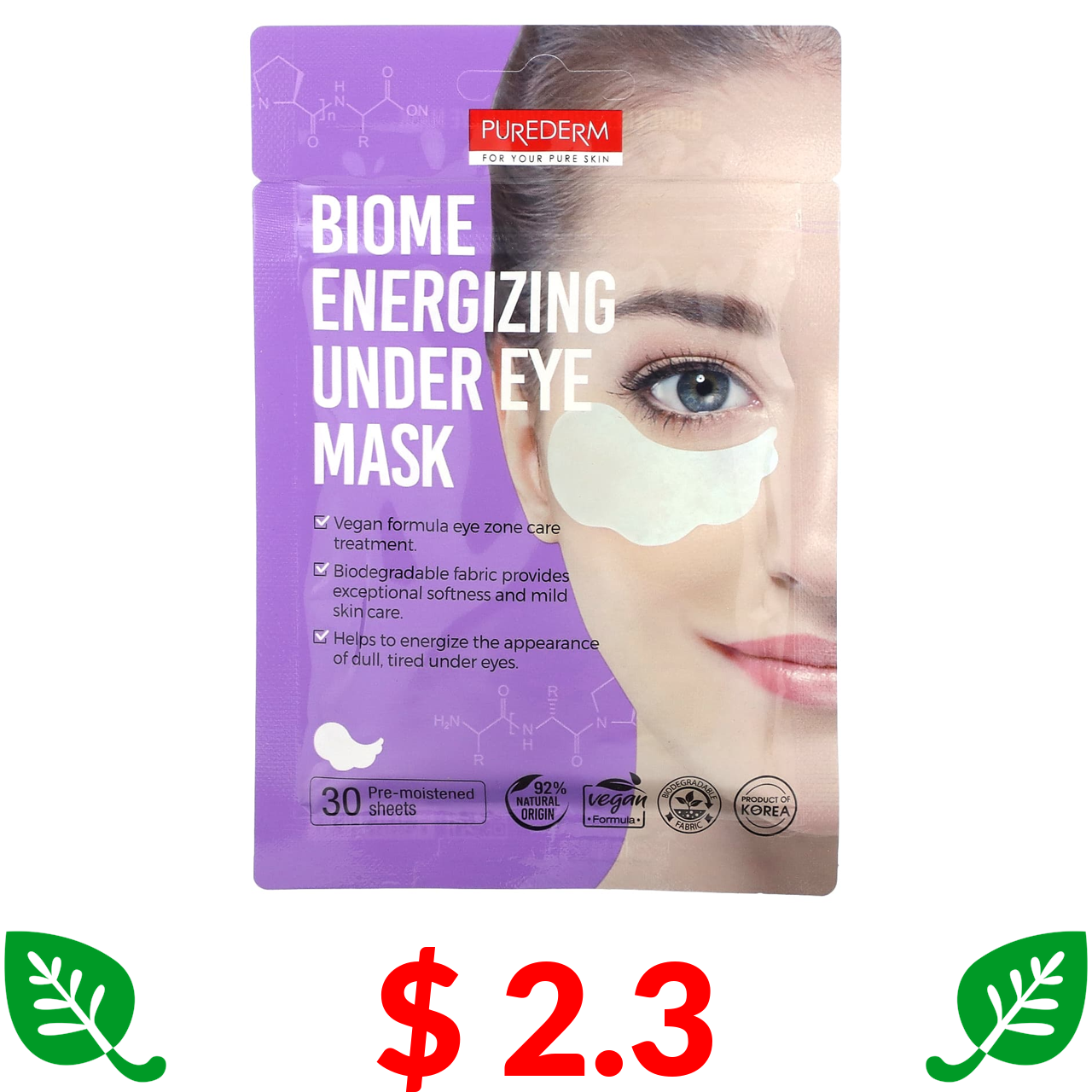 $ 2.3 Purederm, Biome Energizing Under Eye Beauty Mask, увлажняющая маска для глаз, 30 шт.