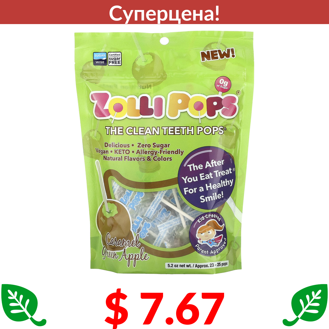 $ 7.67 Золлипопс, The Clean Teeth Pops, зеленое яблоко с карамелью, прибл. 23-25 леденцов, 5,2 унции