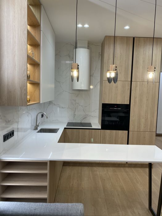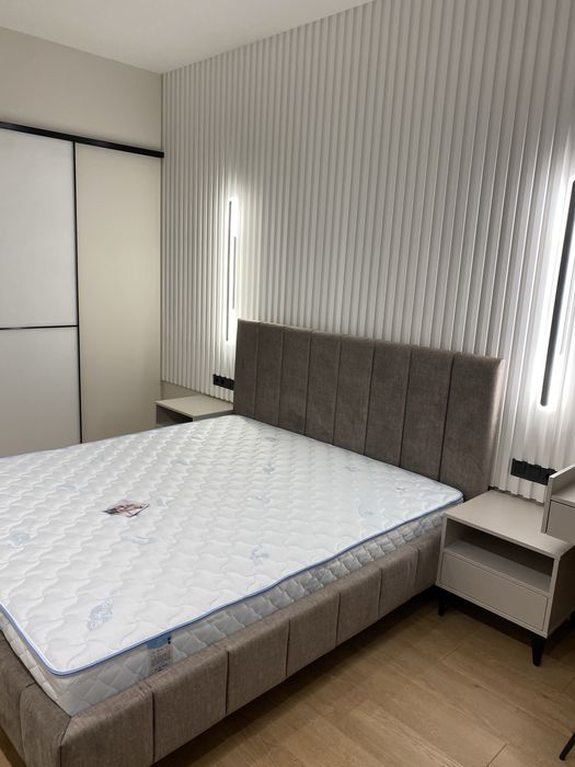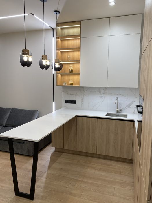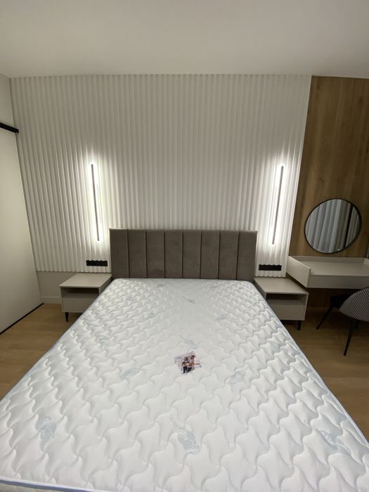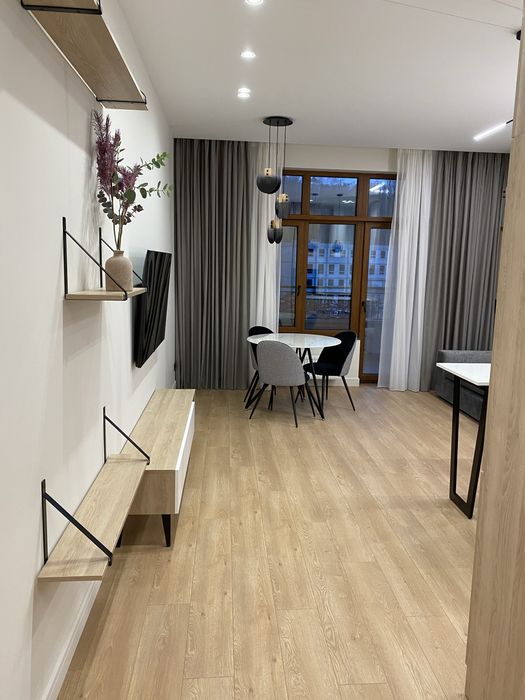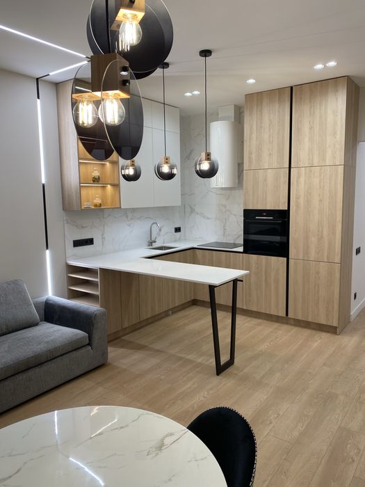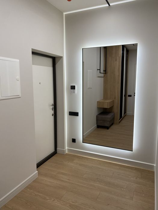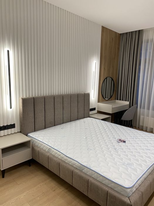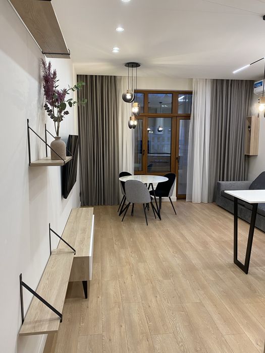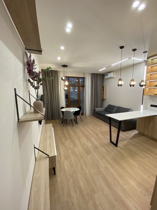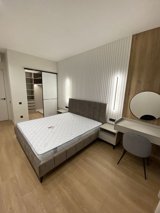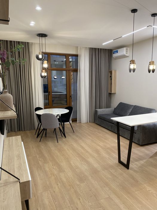 У квартирі зроблено новий сучасний ремонт із використанням якісних матеріалів Європейських виробників. Квартира укомплектована всіма необхідними меблями та побутовою технікою. Є можливість оренди паркомісця у підземному паркінгу.
