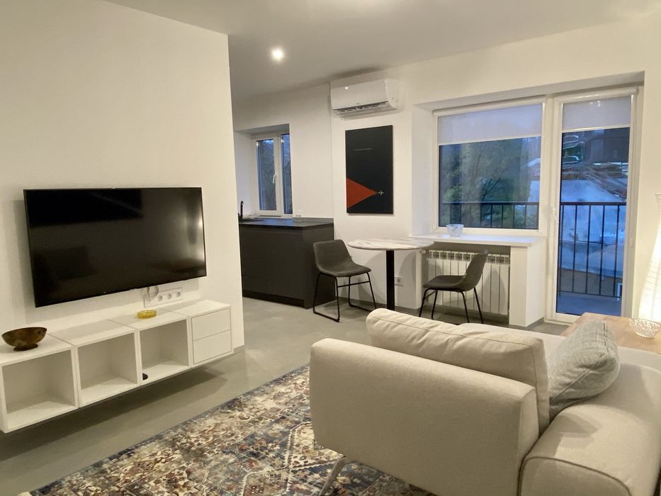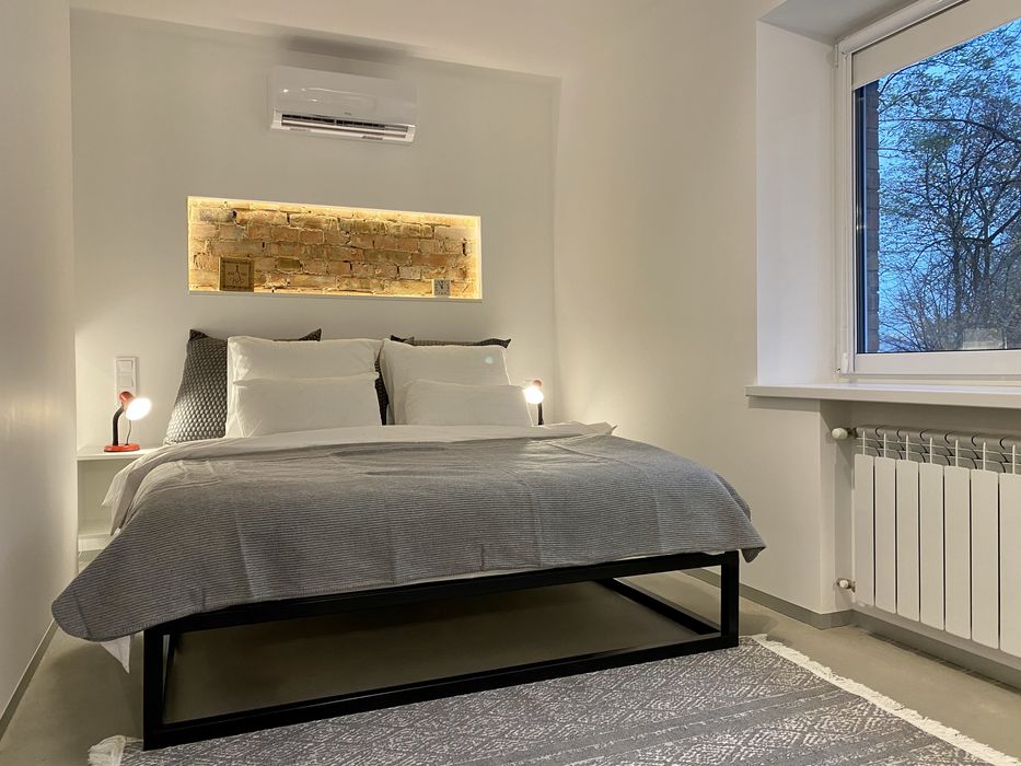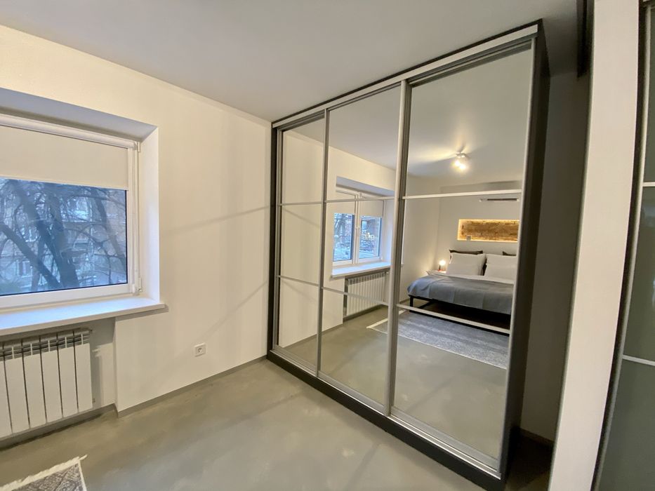 Двокімнатна квартира в стилі лофт на 2-му поверсі (з 4) з балконом на місто в центрі Києва, поблизу бізнес-центрів (Парус тощо), ресторанів, супермаркетів та станції метро (м. Кловська 550 м).