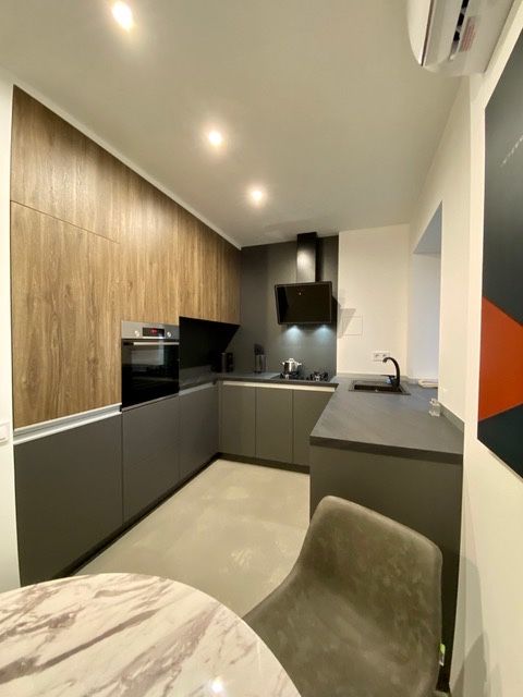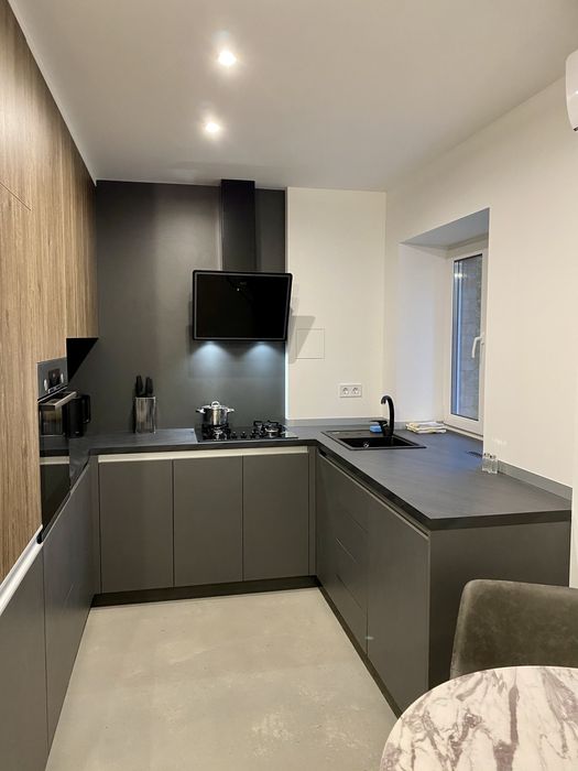 Ремонт виконано за європейськими стандартами з використанням високоякісних матеріалів та вбудованої побутової техніки (BOSCH), у вітальні та спальні встановлено індивідуальні системи кондиціонування.