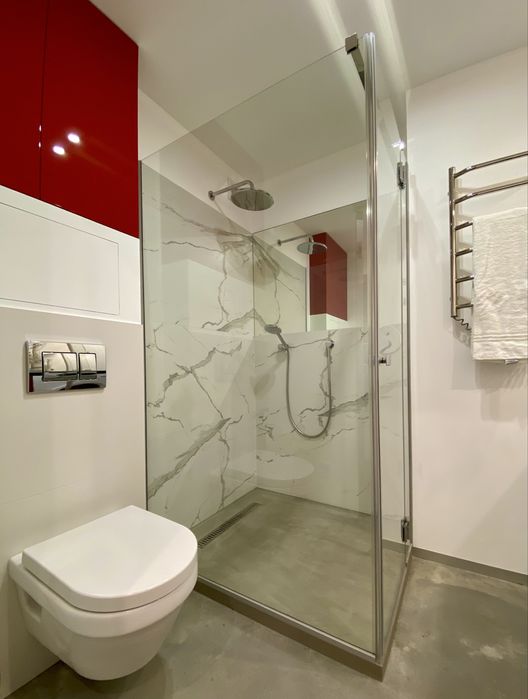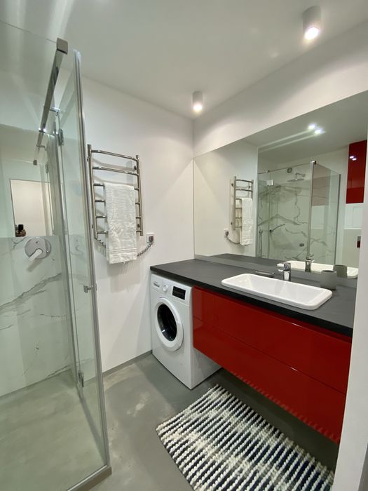 У ванній кімнаті є скляна душова кабіна, настінний унітаз, шухляди, зона з пральною машиною та бойлером.