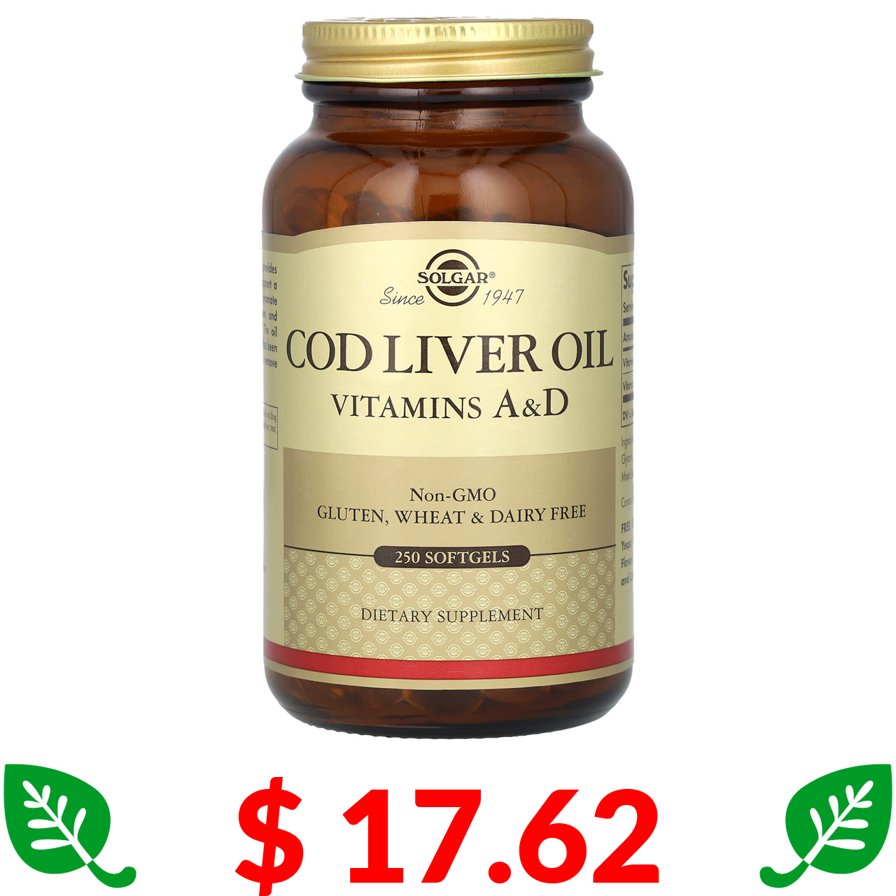 $ 17.62 Солгар, масло печени трески, витамины A и D, 250 капсул