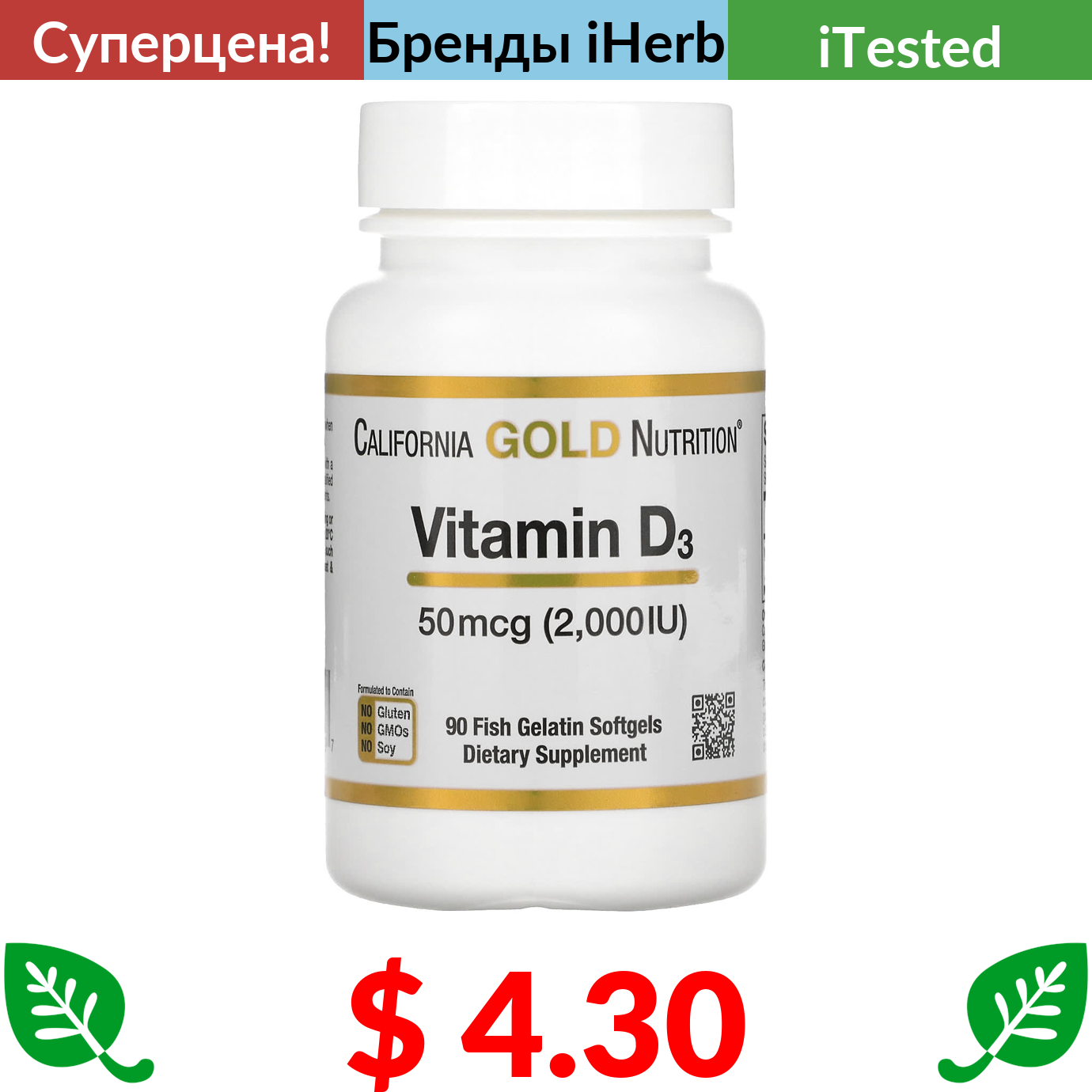 $ 4.30 California Gold Nutrition, витамин D3, 50 мкг (2000 МЕ), 90 рыбно-желатиновых капсул