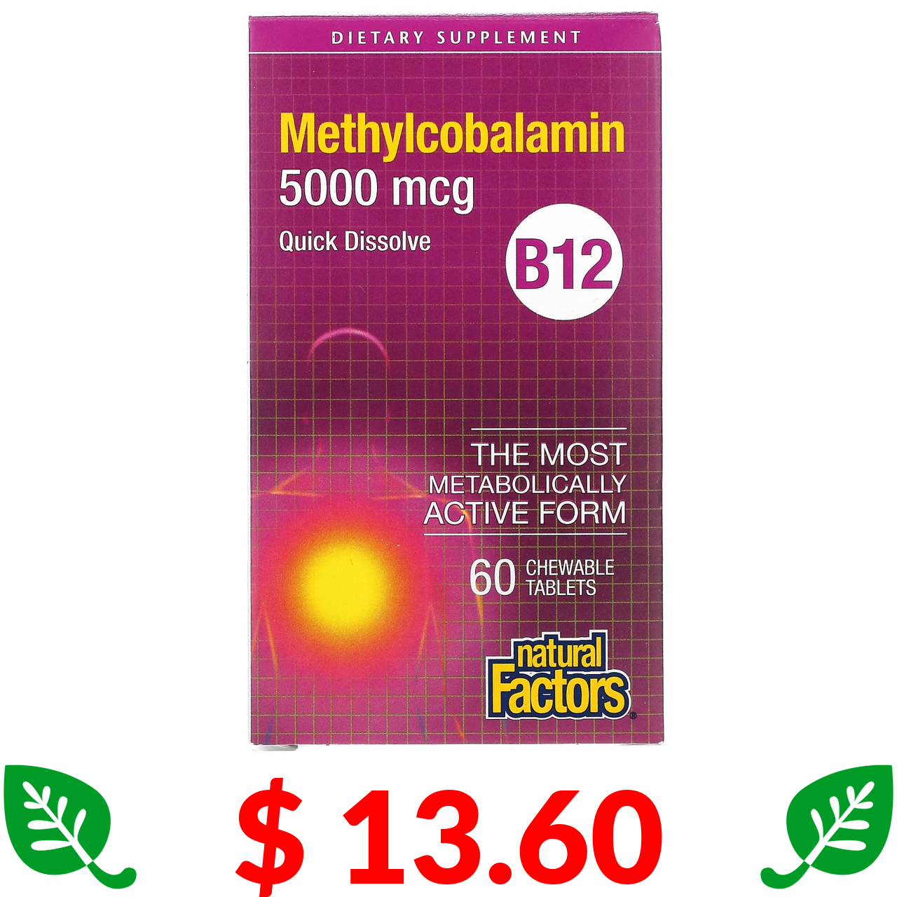 $ 13.60 Natural Factors, витамин B12, метилкобаламин, 5000 мкг, 60 жевательных таблеток