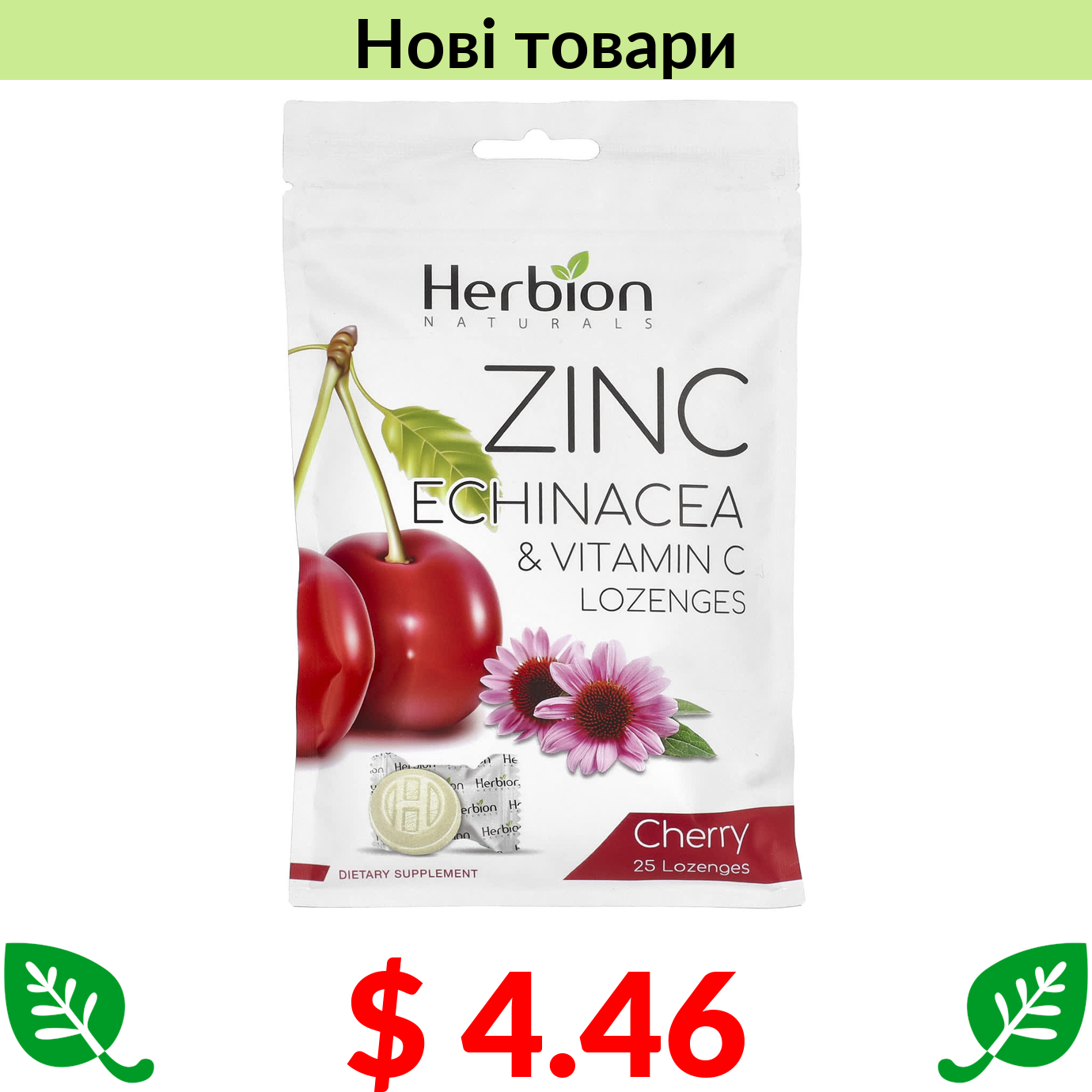 $ 4.46 Herbion, пастилки з цинком і ехінацеєю та вітаміном C, вишня, 25 пастилок