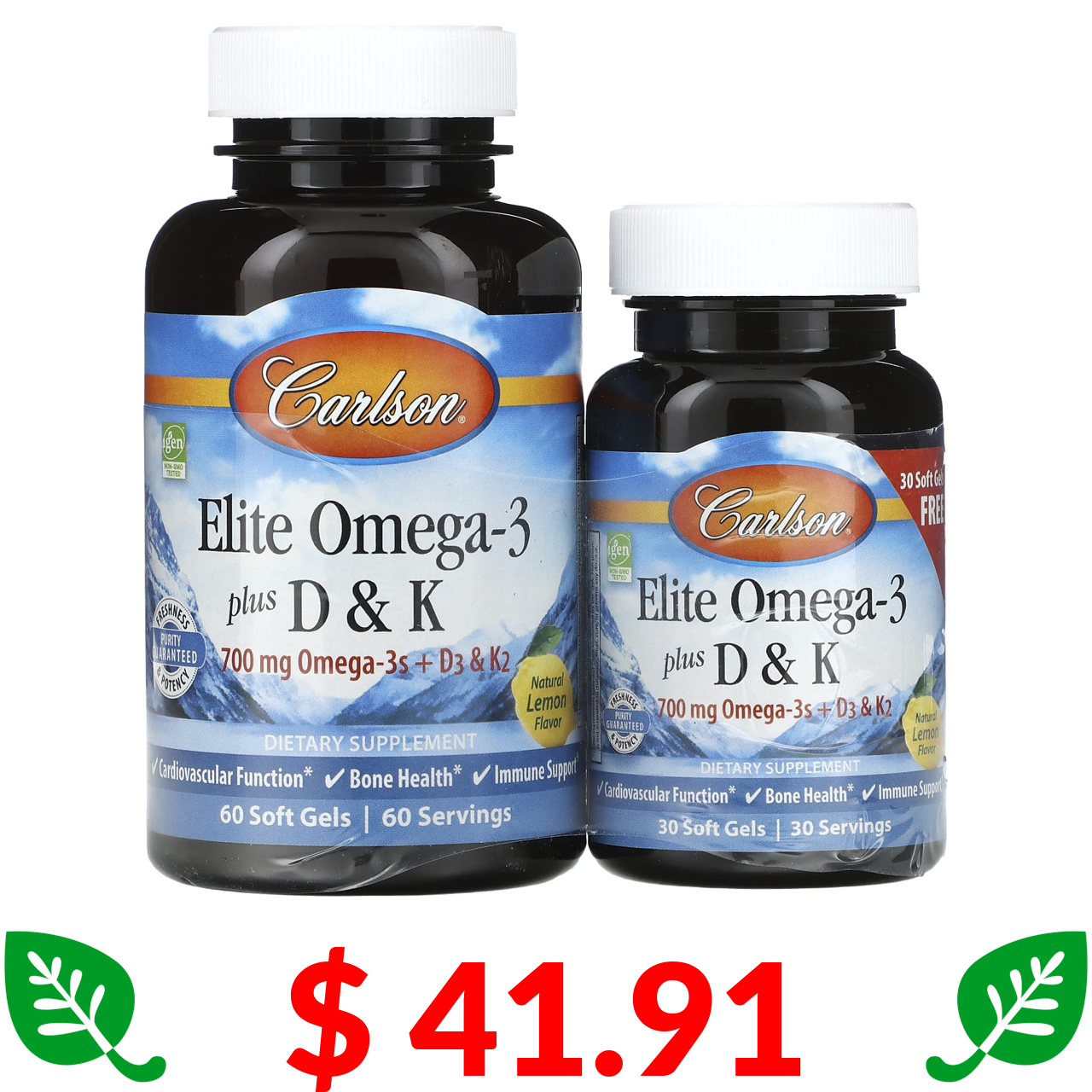 $ 41.91 Carlson, Elite Omega-3 Plus D & K, натуральний смак лимону, 60 капсул+ 30 у подарунок