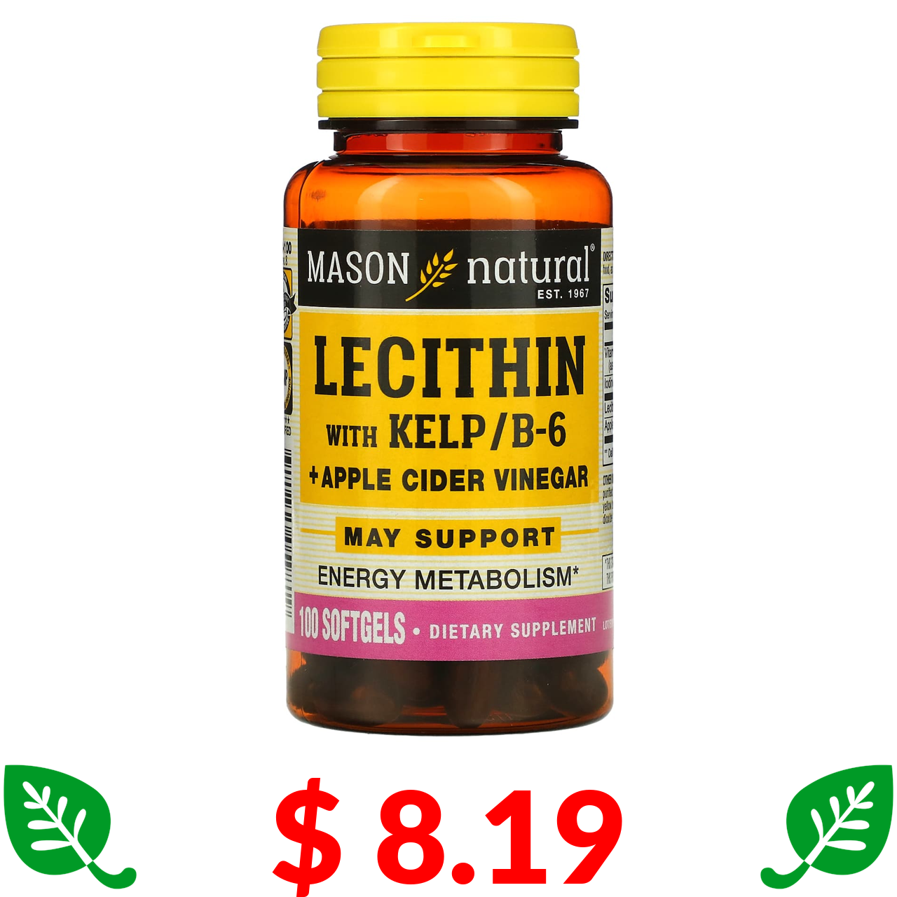 $ 8.19 Mason Natural, лецитин з бурими водоростями/вітаміном B6 і яблучним оцтом, 100 капсул