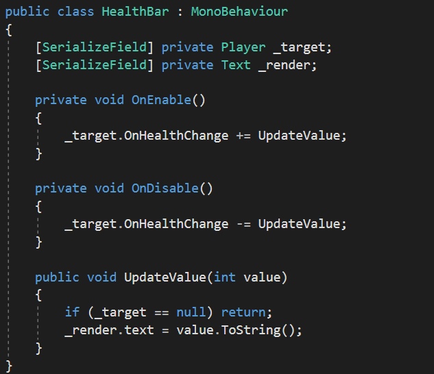 Классическая модель взаимодействия — pull. Она заключается в том, что мы сами просим какие-то данные, и работаем с ними. Так при разработке компонента который рисует здоровье пользователя, мы можем каждый кадр в ручную вытягивать текущее значения здоровья и обновлять интерфейс.