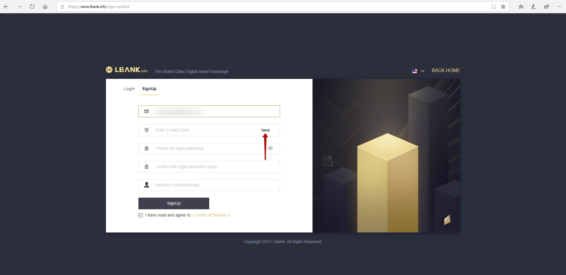 3. 手順1で指定したEメールに6字のコードが表示されているLBANKからのレターを確認します. このコードは, 次の図の番号 1 のフィールドで指定する必要があります. 次の図の 2 と 3 のフィールドに,パスワードを入力します(どちらの場合も一致する必要があります). 次に,"Sign Up(サインアップ)"ボタンをクリックします(下の図の4のマークが付いています).
