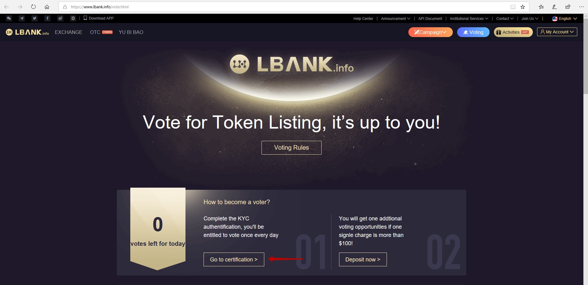 5. 投票ページ- https://www.lbank.info/vote.html. "Go to certification"ボタンをクリックして,KYC手順に進みます.