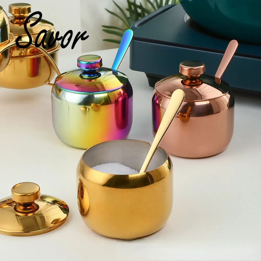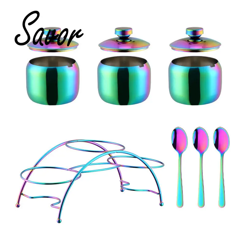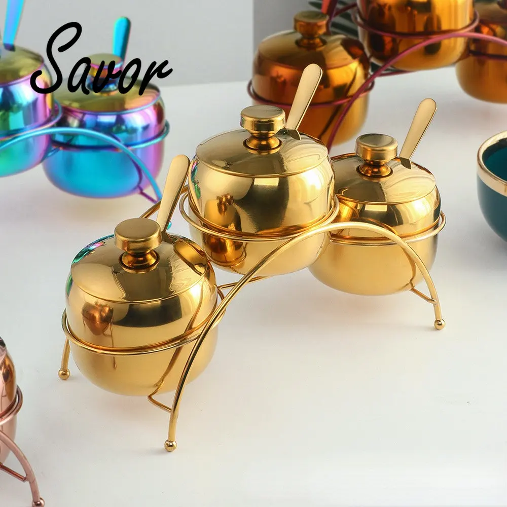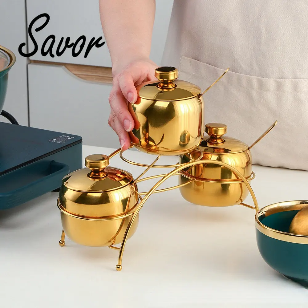 304 Stainless Steel Gold Seasoning Condiment Pot Set Spice Salt Sugar Container Pepper Jar Tool with Lid and Spoon Holder Rack - Купить с бесплатной доставкой