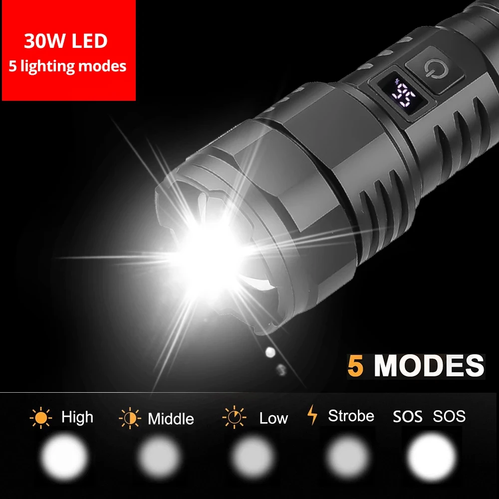 MGVibtuLHere you can buy 30W LED High Power Flashlight USB Rechargeable 26650 Torch with Power Display Screen Waterproof Zoom Camping Fishing Lantern with free delivery to your post office.